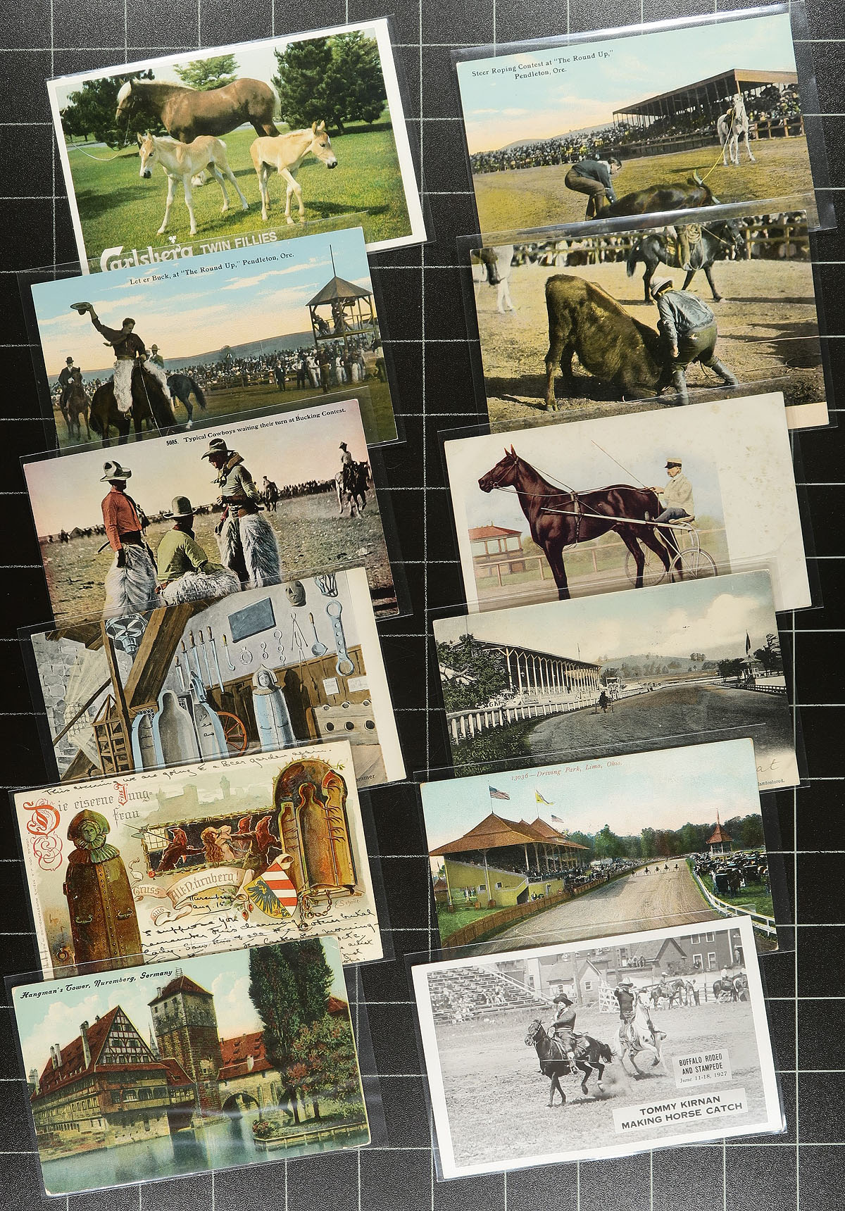 A diverse selection of several different topics of postcards, while not enough of any one topic for a single lot, together the make for a juggernaut postcard selection. Included, in no particular order. 1) Topical Collection of "Piers" featuring 26 early, mostly British postcards featuring seaside piers. 2) Franco British Exhibition 1908 group of four patriotic postcards. 3) Prison Tower / Torture Towers (a bit grim), with 4 early Germany postcards showing Prison Towers or Torture Chambers. 4) A pair of suffragette postcards (illustrated). 5) Horses on Postcards (13 in total), mostly ranching / stampede related. 6) Zieher stamp illustrated postcards x3 (Guatemala, USA, Mexico). 7) Patriotic Flag Postcards x9 (all earlier, mostly UK / USA). 8) WWI Illustrated Humor Postcards x8, mostly poking fun at "The Kaiser". A total of 69 postcards, perfect for the collector or dealer. Estimate =
