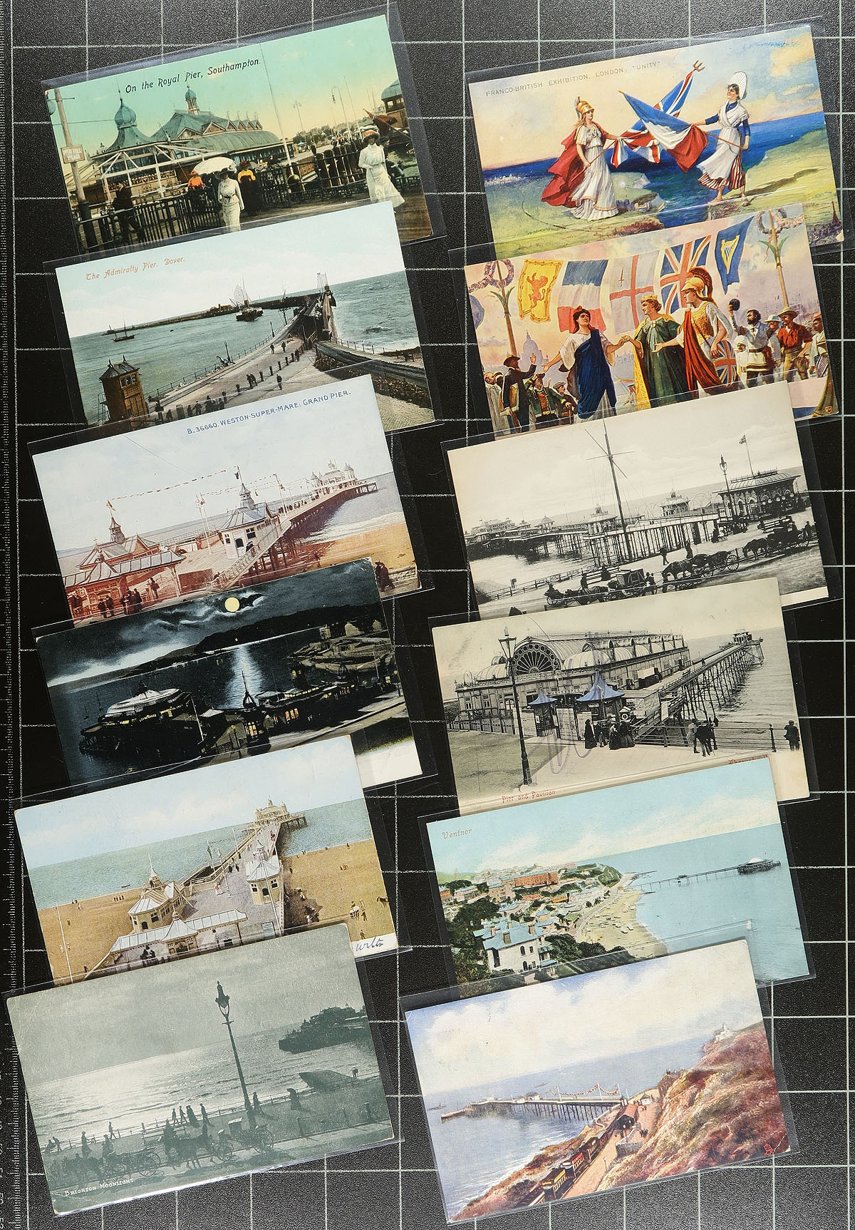 A diverse selection of several different topics of postcards, while not enough of any one topic for a single lot, together the make for a juggernaut postcard selection. Included, in no particular order. 1) Topical Collection of "Piers" featuring 26 early, mostly British postcards featuring seaside piers. 2) Franco British Exhibition 1908 group of four patriotic postcards. 3) Prison Tower / Torture Towers (a bit grim), with 4 early Germany postcards showing Prison Towers or Torture Chambers. 4) A pair of suffragette postcards (illustrated). 5) Horses on Postcards (13 in total), mostly ranching / stampede related. 6) Zieher stamp illustrated postcards x3 (Guatemala, USA, Mexico). 7) Patriotic Flag Postcards x9 (all earlier, mostly UK / USA). 8) WWI Illustrated Humor Postcards x8, mostly poking fun at "The Kaiser". A total of 69 postcards, perfect for the collector or dealer. Estimate =