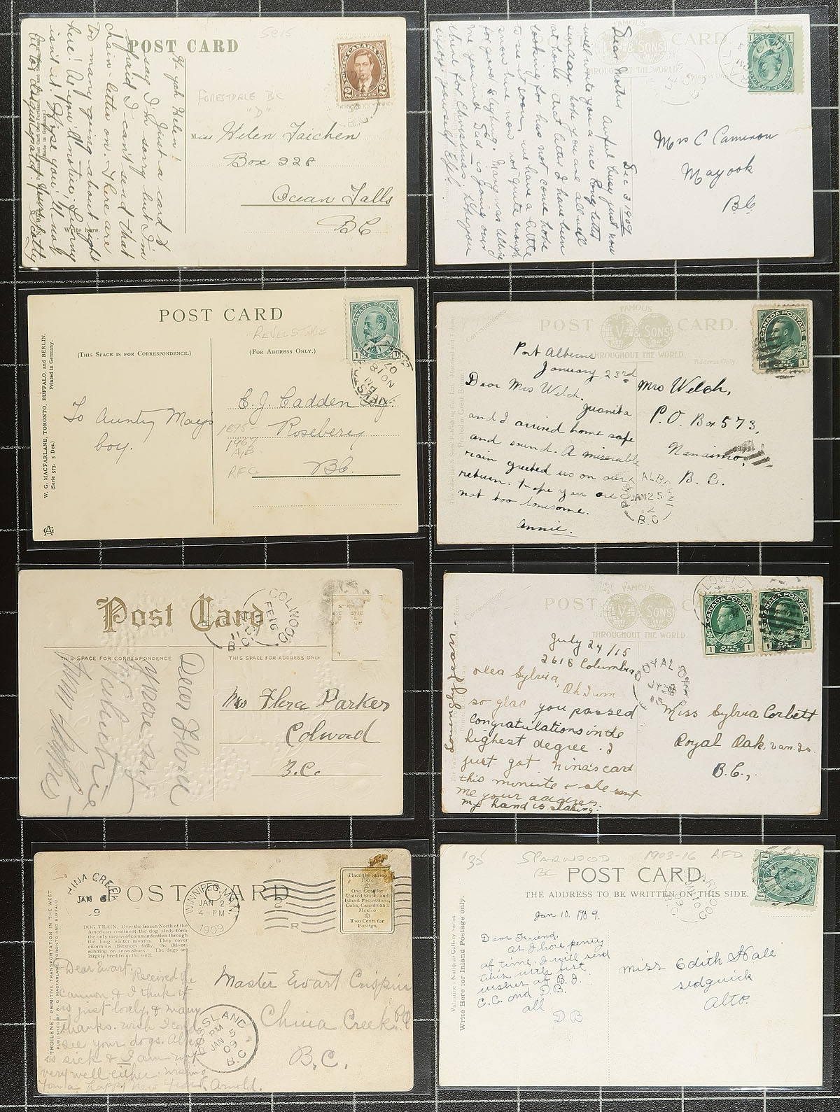 British Columbia Split Ring Postcards. An old-time hoard of 25 split ring cancels on postcards, mostly Edward / Admiral era from a local estate. Towns included are Mayook, Port Alberni, Royal Oak, Sparwood, Forestdale, Roseberry, Colwood, China Creek, Sirdar, Goldstream, Halcyon Hot Springs, Ganges, Mount Tolmie, Alberni, Rosedale, Syringa Creek, Gambier, Burrard Inlet, North Lonsdale (CDS), Extension, Hopkins Landing, Port Haney, North Bend, Cottonwood and Northbend. A nice opportunity for the BC postmark enthusiast. Estimate =