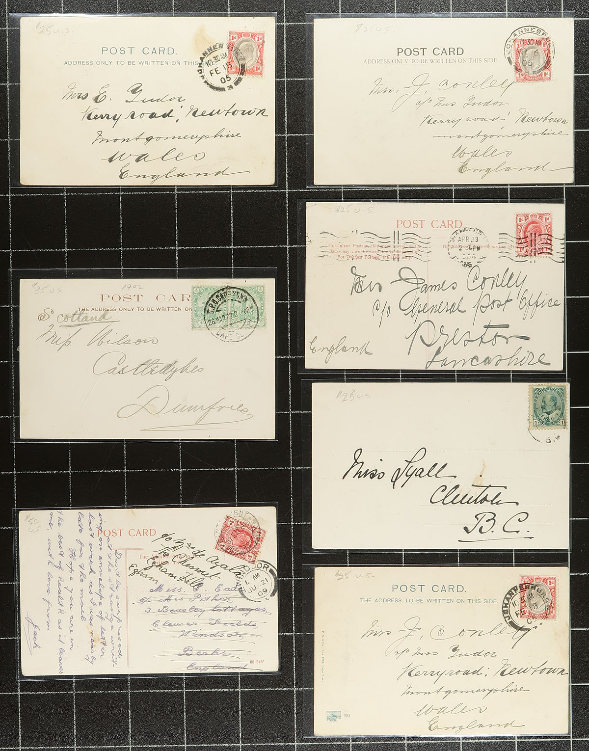 South Africa Postcards. An early selection of 52x early South African postcards, primarily from the pre-1910 Edward era, plus two early greeting cards (from Capetown, 1905 and 1906 respectively). About half are used, with Cape of Good Hope / Transvaal frankings, and with a variety of scenes including Gold Mines, Street Scenes, Post Offices, Law Courts, Ships in Harbour, Art Gallery etc. All are individually sleeved, about half have the original dealer pricing of $25.00 per postcard! Estimate =