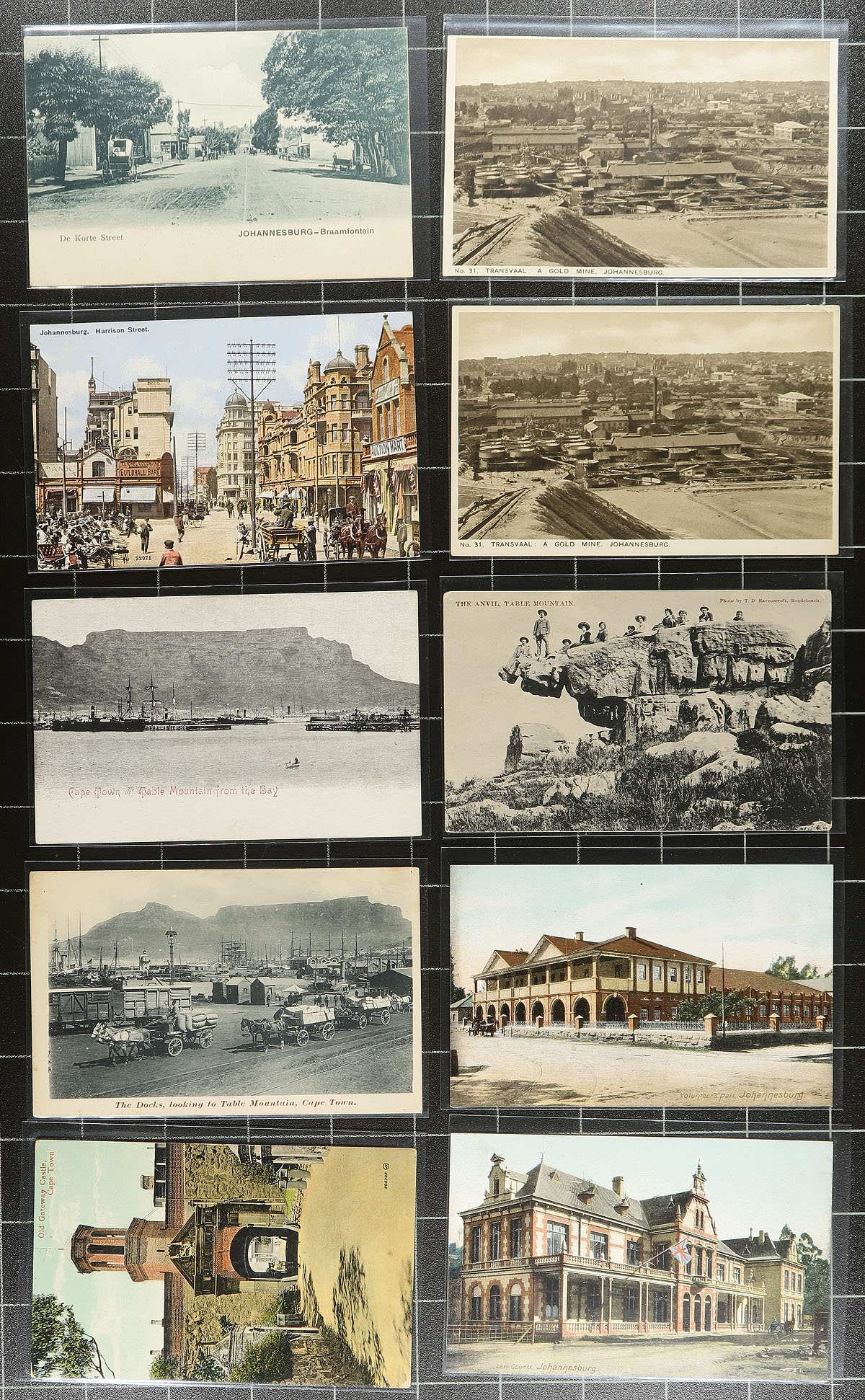 South Africa Postcards. An early selection of 52x early South African postcards, primarily from the pre-1910 Edward era, plus two early greeting cards (from Capetown, 1905 and 1906 respectively). About half are used, with Cape of Good Hope / Transvaal frankings, and with a variety of scenes including Gold Mines, Street Scenes, Post Offices, Law Courts, Ships in Harbour, Art Gallery etc. All are individually sleeved, about half have the original dealer pricing of $25.00 per postcard! Estimate =