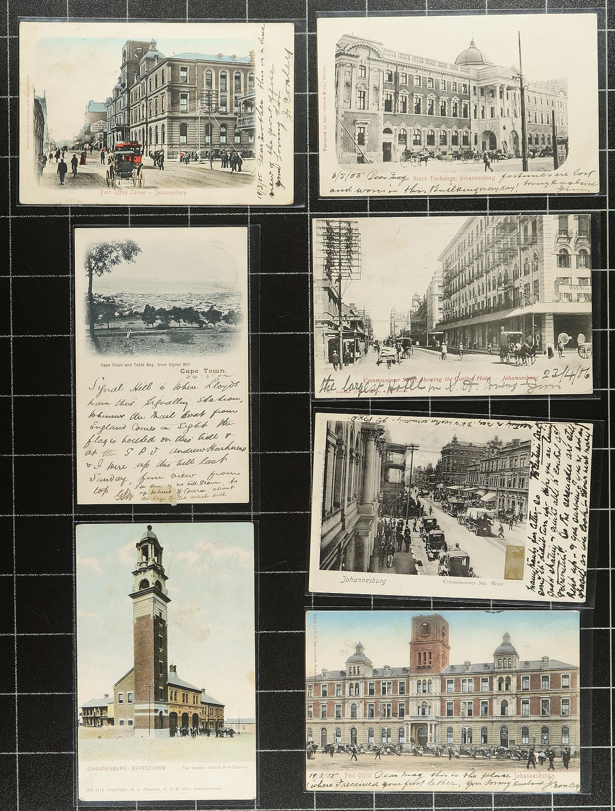 South Africa Postcards. An early selection of 52x early South African postcards, primarily from the pre-1910 Edward era, plus two early greeting cards (from Capetown, 1905 and 1906 respectively). About half are used, with Cape of Good Hope / Transvaal frankings, and with a variety of scenes including Gold Mines, Street Scenes, Post Offices, Law Courts, Ships in Harbour, Art Gallery etc. All are individually sleeved, about half have the original dealer pricing of $25.00 per postcard! Estimate =