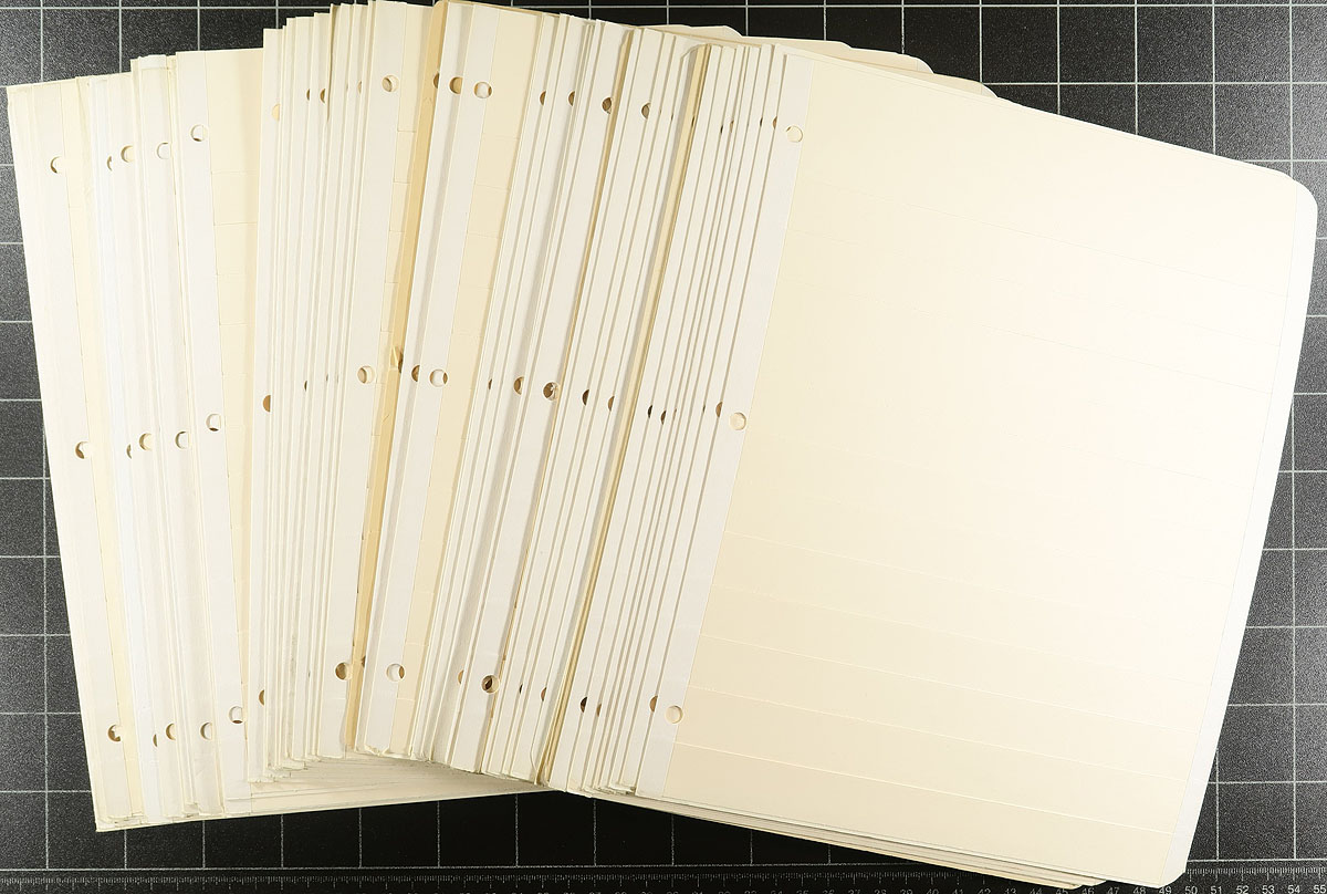 Manila Stocksheets. A small box containing 100 lightly / moderately used stocksheets. The standard 3-ring hole punch pages are ready to be given a binder and live another day. The "new" retail cost on these is over $150.00. A very cost-effective way to store your duplicates without having to pay retail for them. Estimate =