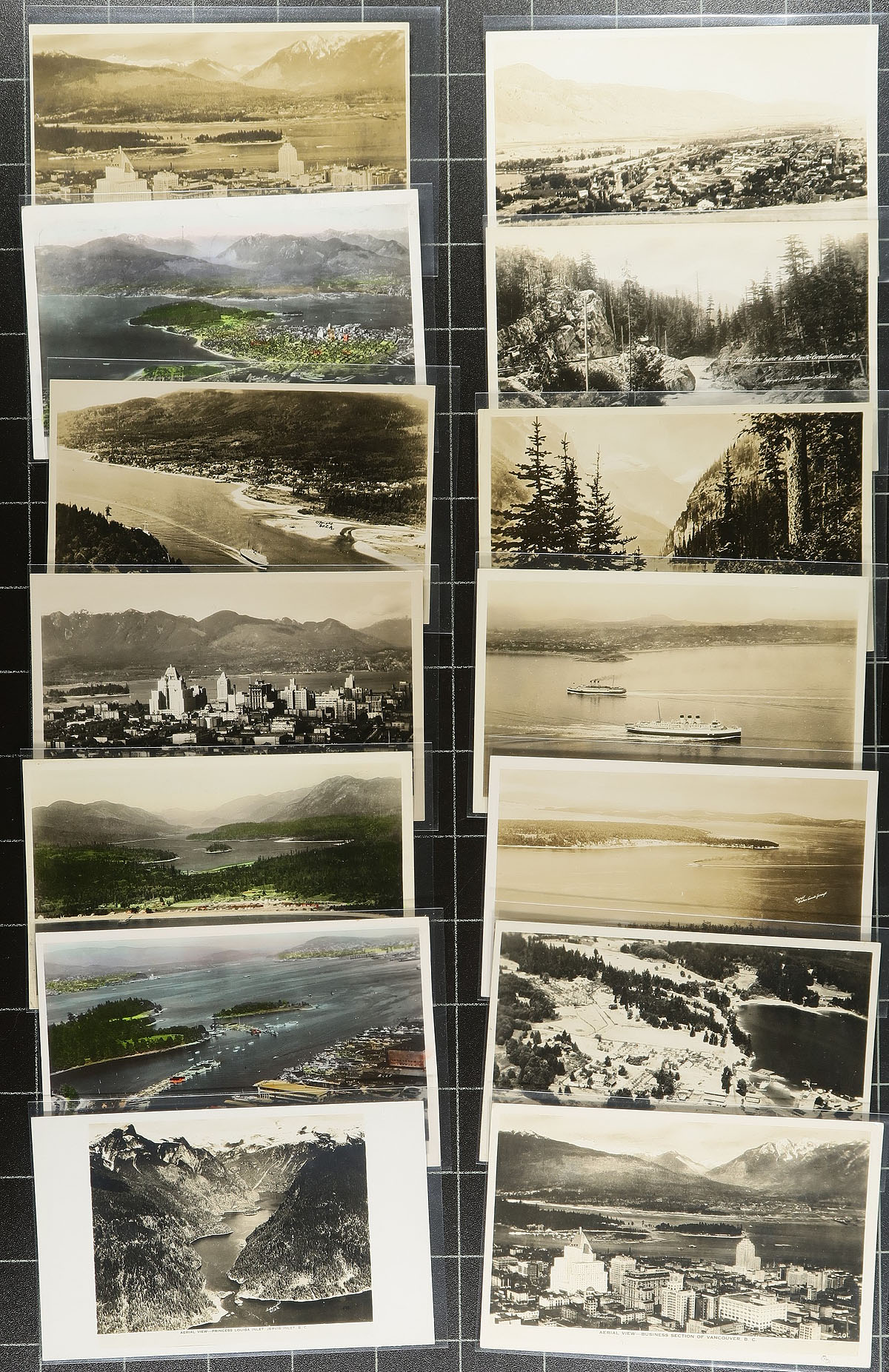 Postcards. A lovely selection of 120 postcards, published by the Gowen Sutton Company, all being RPPC (real photo postcards), with some being colorized RPPC. A nice variety of views, including Aerial Views (noted several), Steamships, Rockies, Street Views, CPR / CNR Railways, Vancouver, Kootenays, Cariboo, Okanagan, Gulf Islands etc. A trip-back in time to how many of these areas looked near 100 years ago. Each card is individually sleeved by the previous owner to protect the condition. Estimate =