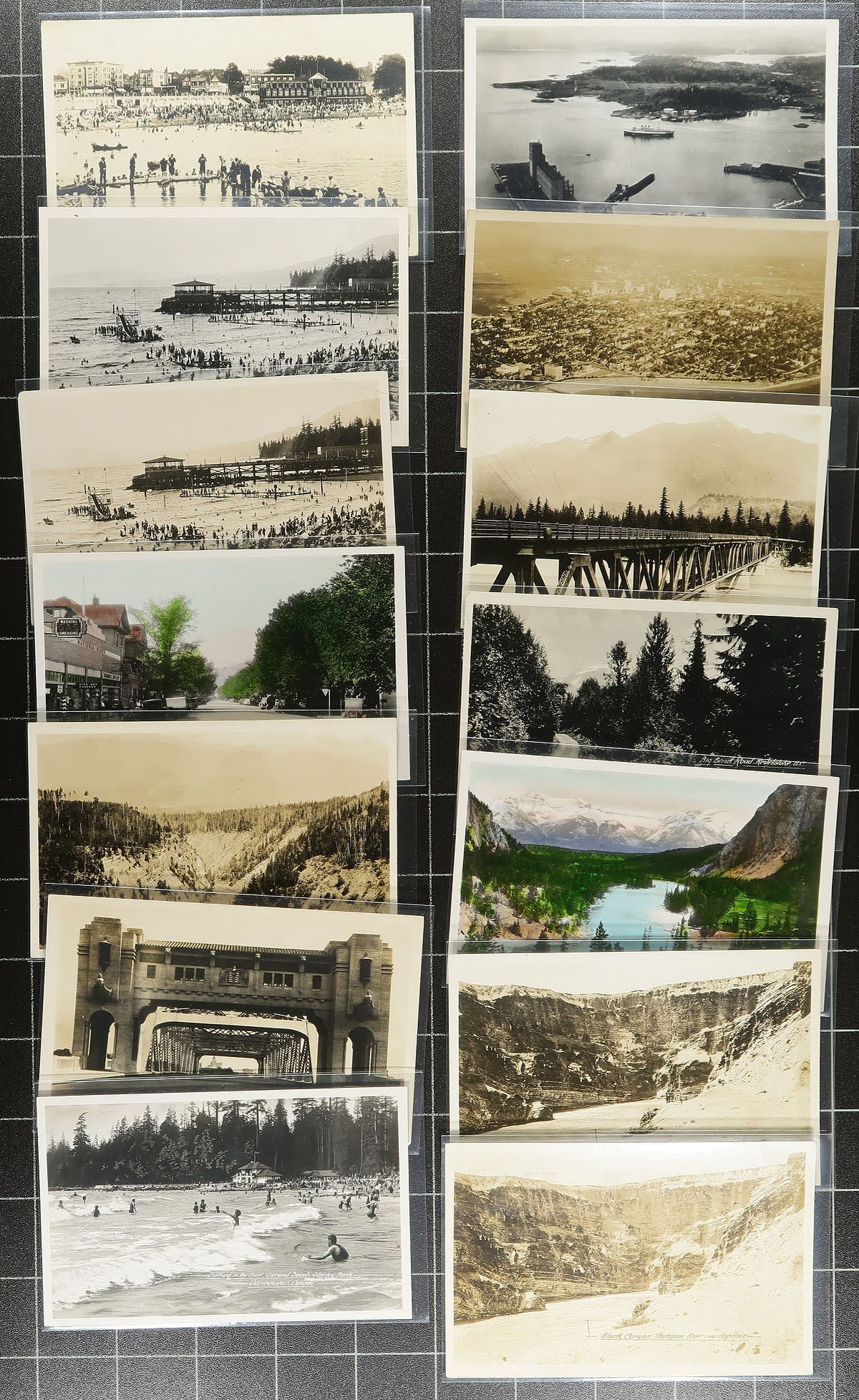 Postcards. A lovely selection of 120 postcards, published by the Gowen Sutton Company, all being RPPC (real photo postcards), with some being colorized RPPC. A nice variety of views, including Aerial Views (noted several), Steamships, Rockies, Street Views, CPR / CNR Railways, Vancouver, Kootenays, Cariboo, Okanagan, Gulf Islands etc. A trip-back in time to how many of these areas looked near 100 years ago. Each card is individually sleeved by the previous owner to protect the condition. Estimate =
