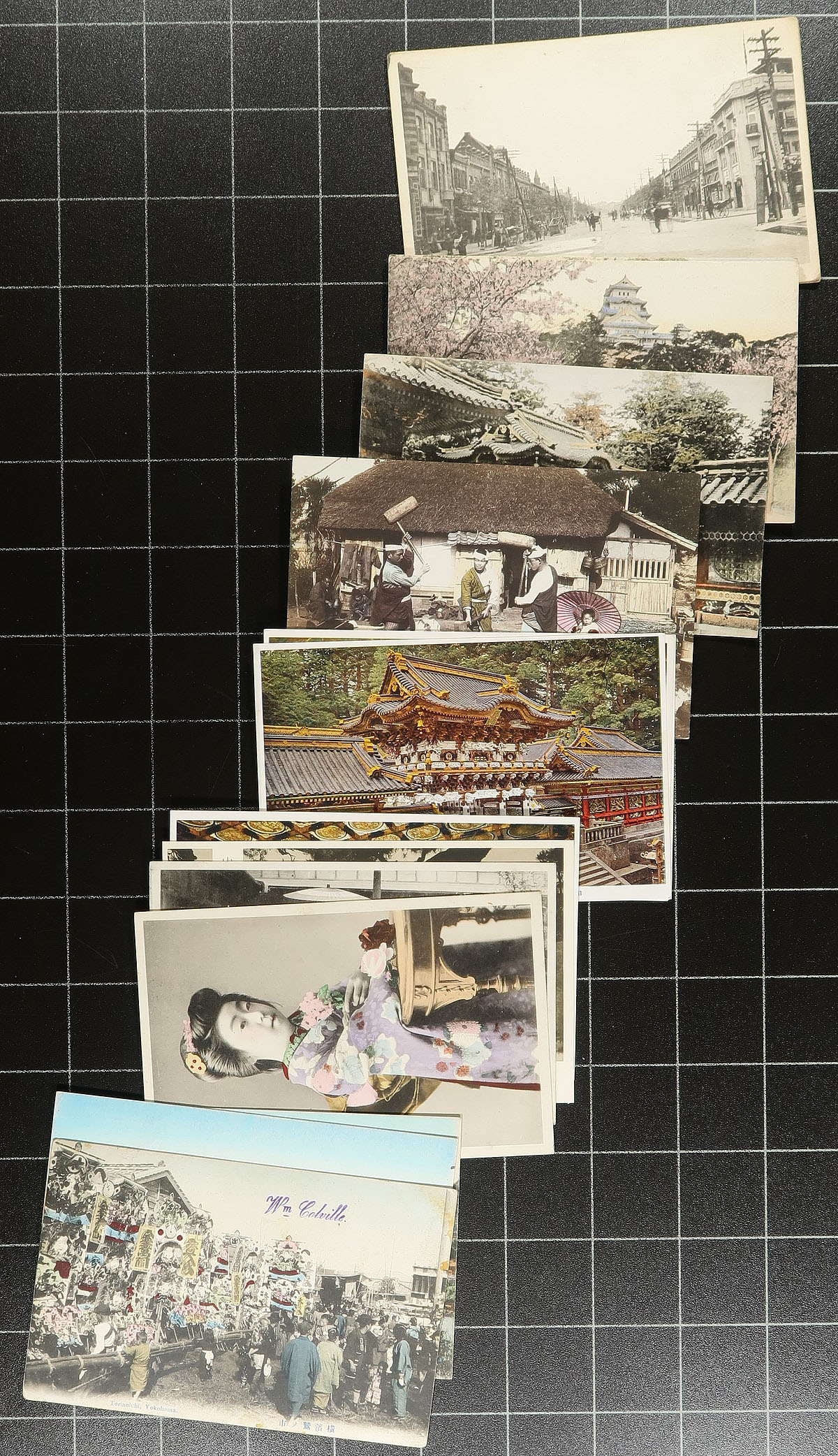 Japan. A collector's accumulation of over 200 postcards (201 to be exact), with a very nice mix of "classic" pre-1920 postcards (including hand-coloured), up to the 1950's era. Of particular note, are view of the Temples, Japanese ladies, town / landscape and social life. A very clean group. Estimate =