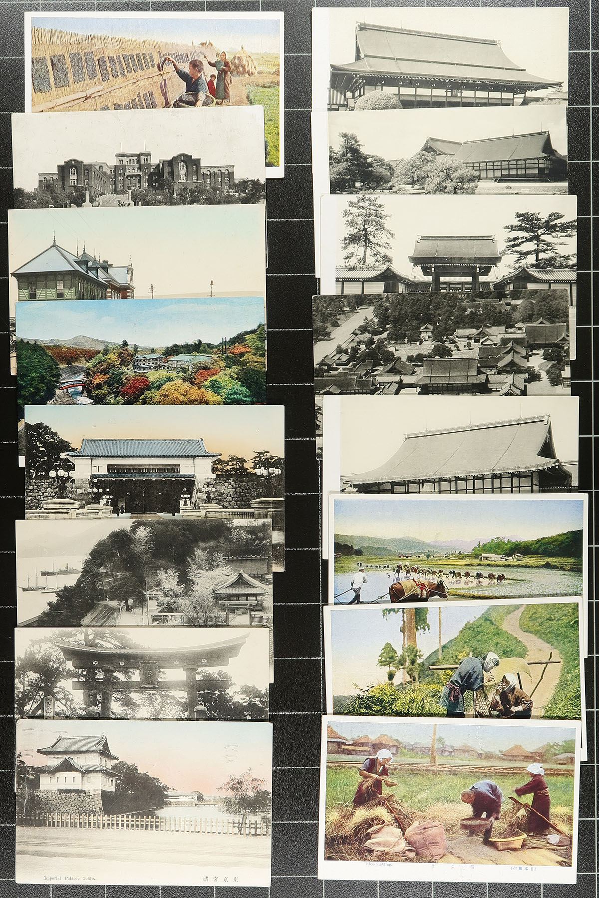 Japan. A collector's accumulation of over 200 postcards (201 to be exact), with a very nice mix of "classic" pre-1920 postcards (including hand-coloured), up to the 1950's era. Of particular note, are view of the Temples, Japanese ladies, town / landscape and social life. A very clean group. Estimate =