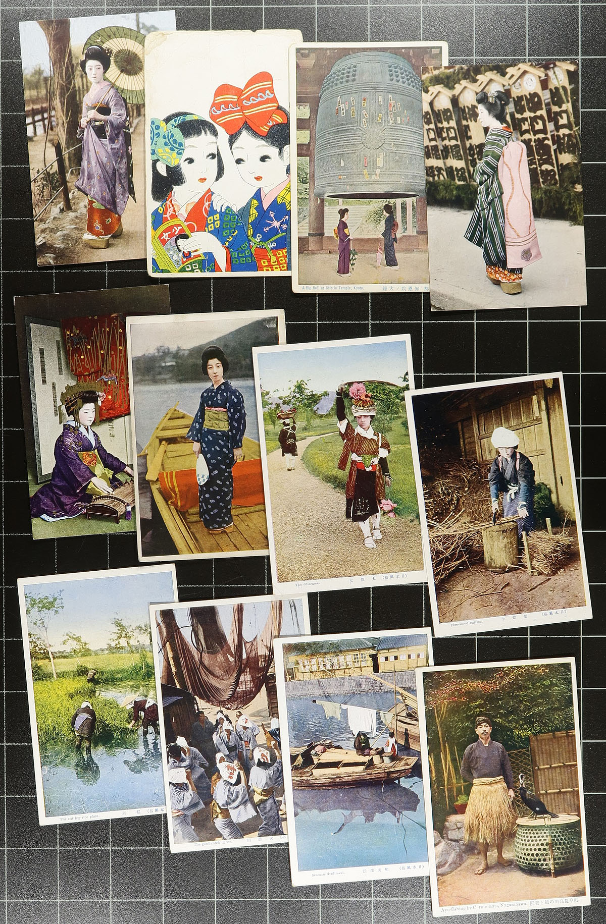 Japan. A collector's accumulation of over 200 postcards (201 to be exact), with a very nice mix of "classic" pre-1920 postcards (including hand-coloured), up to the 1950's era. Of particular note, are view of the Temples, Japanese ladies, town / landscape and social life. A very clean group. Estimate =