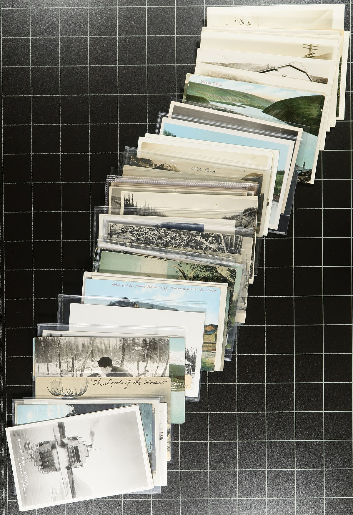 Postcards. A seldom offered selection of Yukon Territory / Northern Canada picture postcards, with 57 postcard, plus one small photograph. A nice assortment of views, with many pre-1920 and RPPC (real photo postcard). Noted views of Steamships, Hunting, Lake Bennett, Kluane Lake, Yukon Gold Company, White Pass & Yukon Route related etc. A lovely batch, some still in the original dealer sleeves from when purchased. Estimate =