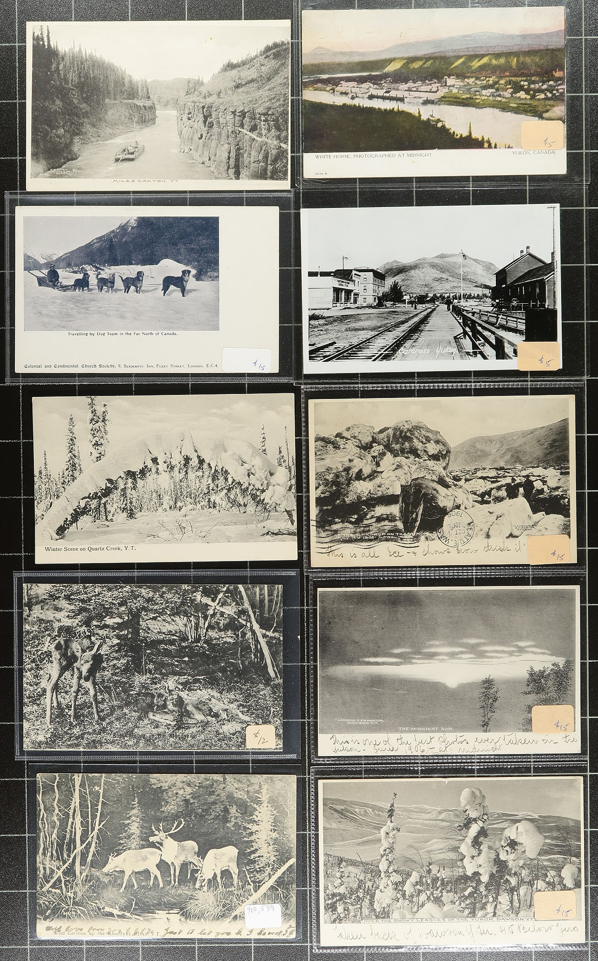 Postcards. A seldom offered selection of Yukon Territory / Northern Canada picture postcards, with 57 postcard, plus one small photograph. A nice assortment of views, with many pre-1920 and RPPC (real photo postcard). Noted views of Steamships, Hunting, Lake Bennett, Kluane Lake, Yukon Gold Company, White Pass & Yukon Route related etc. A lovely batch, some still in the original dealer sleeves from when purchased. Estimate =