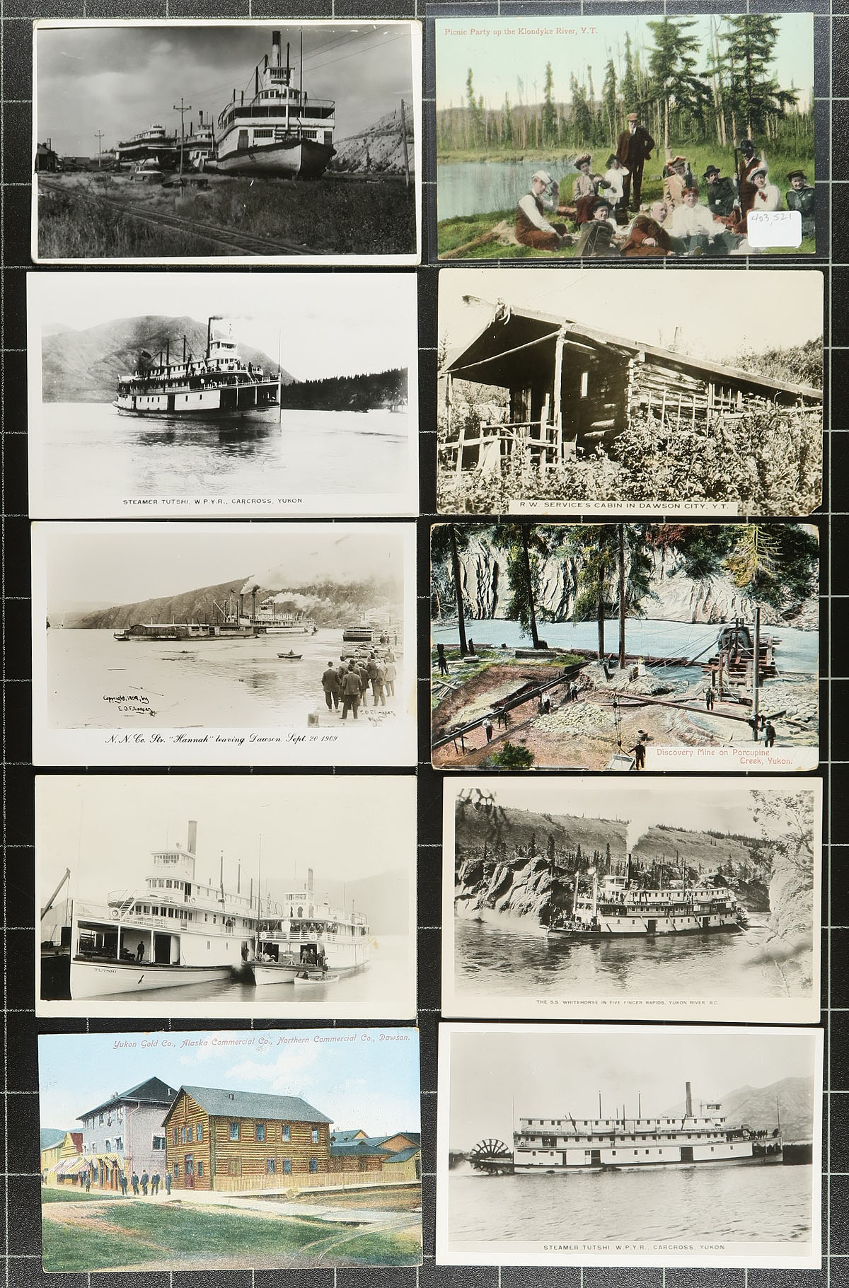 Postcards. A seldom offered selection of Yukon Territory / Northern Canada picture postcards, with 57 postcard, plus one small photograph. A nice assortment of views, with many pre-1920 and RPPC (real photo postcard). Noted views of Steamships, Hunting, Lake Bennett, Kluane Lake, Yukon Gold Company, White Pass & Yukon Route related etc. A lovely batch, some still in the original dealer sleeves from when purchased. Estimate =