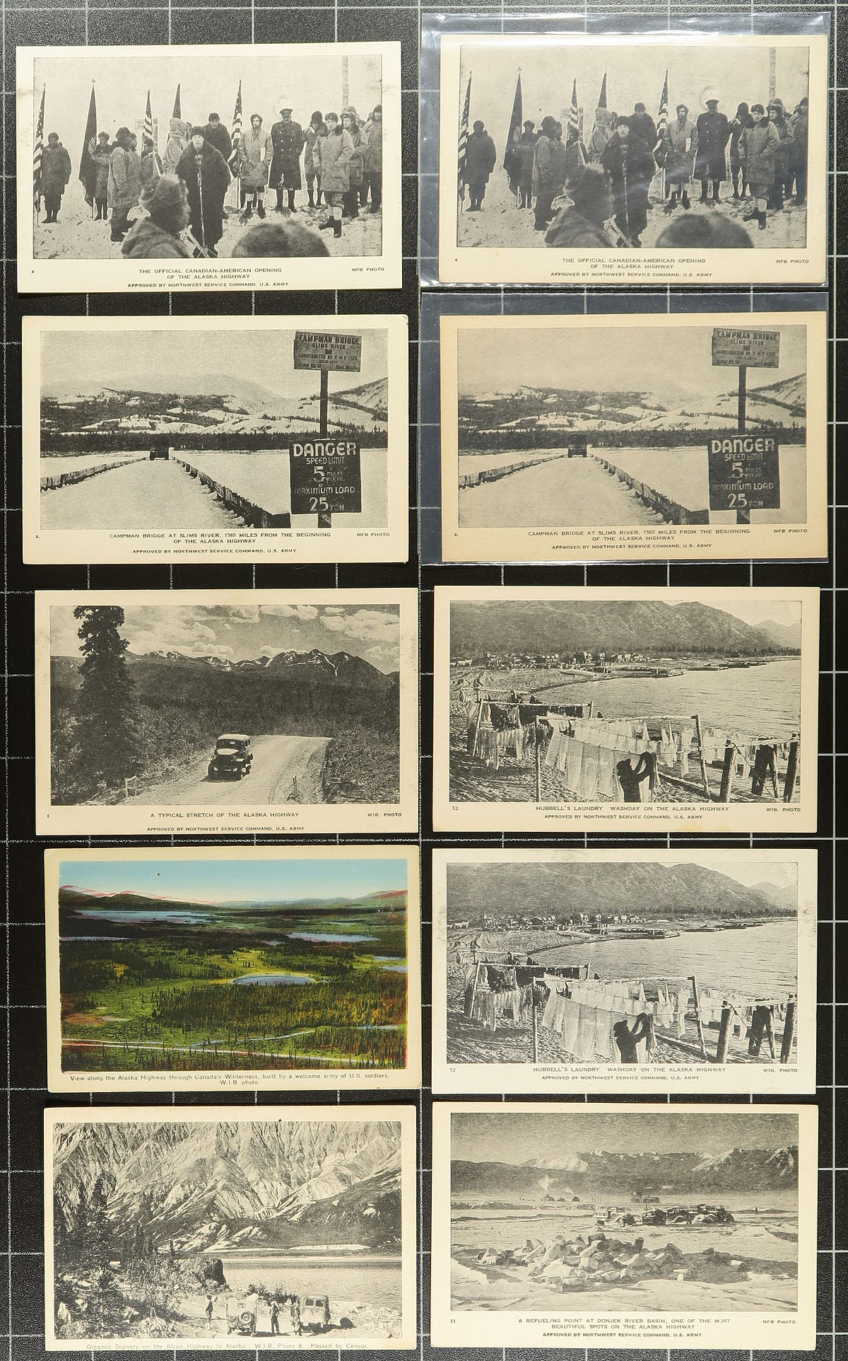 Postcards. Alaska Highway Postcard Accumulation. A large offering of 66 postcards, all relating the construction and opening of the Alaska Highway. Noted many RPPC (real photo postcards), produced by the US Wartime Information Board. A couple duplicates noted, but overall a very diverse and far more than we usually see on one place. Estimate =