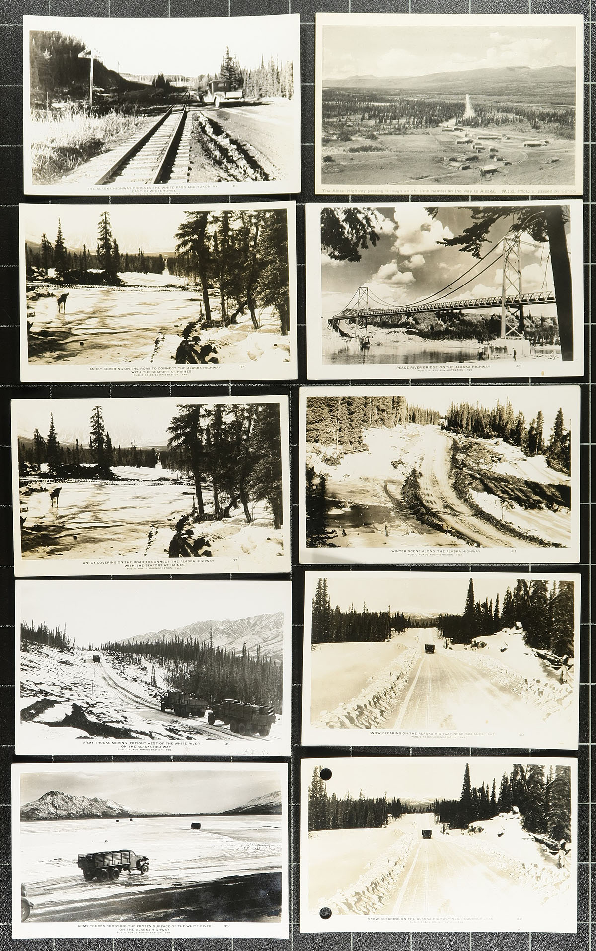Postcards. Alaska Highway Postcard Accumulation. A large offering of 66 postcards, all relating the construction and opening of the Alaska Highway. Noted many RPPC (real photo postcards), produced by the US Wartime Information Board. A couple duplicates noted, but overall a very diverse and far more than we usually see on one place. Estimate =