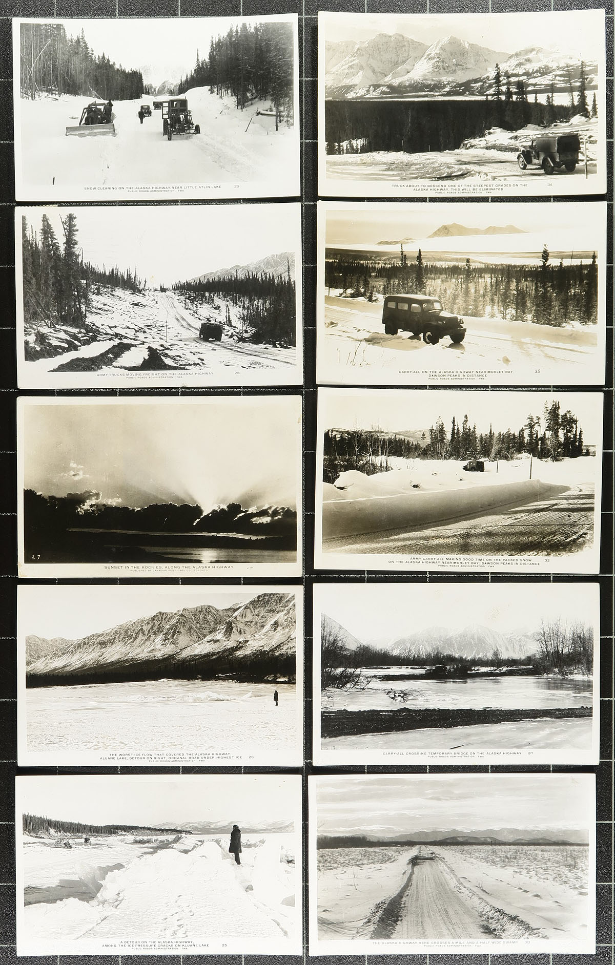Postcards. Alaska Highway Postcard Accumulation. A large offering of 66 postcards, all relating the construction and opening of the Alaska Highway. Noted many RPPC (real photo postcards), produced by the US Wartime Information Board. A couple duplicates noted, but overall a very diverse and far more than we usually see on one place. Estimate =
