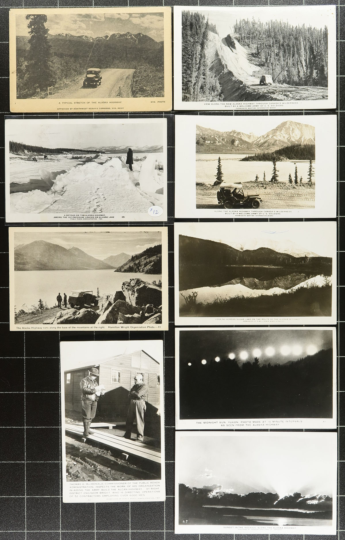 Postcards. Alaska Highway Postcard Accumulation. A large offering of 66 postcards, all relating the construction and opening of the Alaska Highway. Noted many RPPC (real photo postcards), produced by the US Wartime Information Board. A couple duplicates noted, but overall a very diverse and far more than we usually see on one place. Estimate =