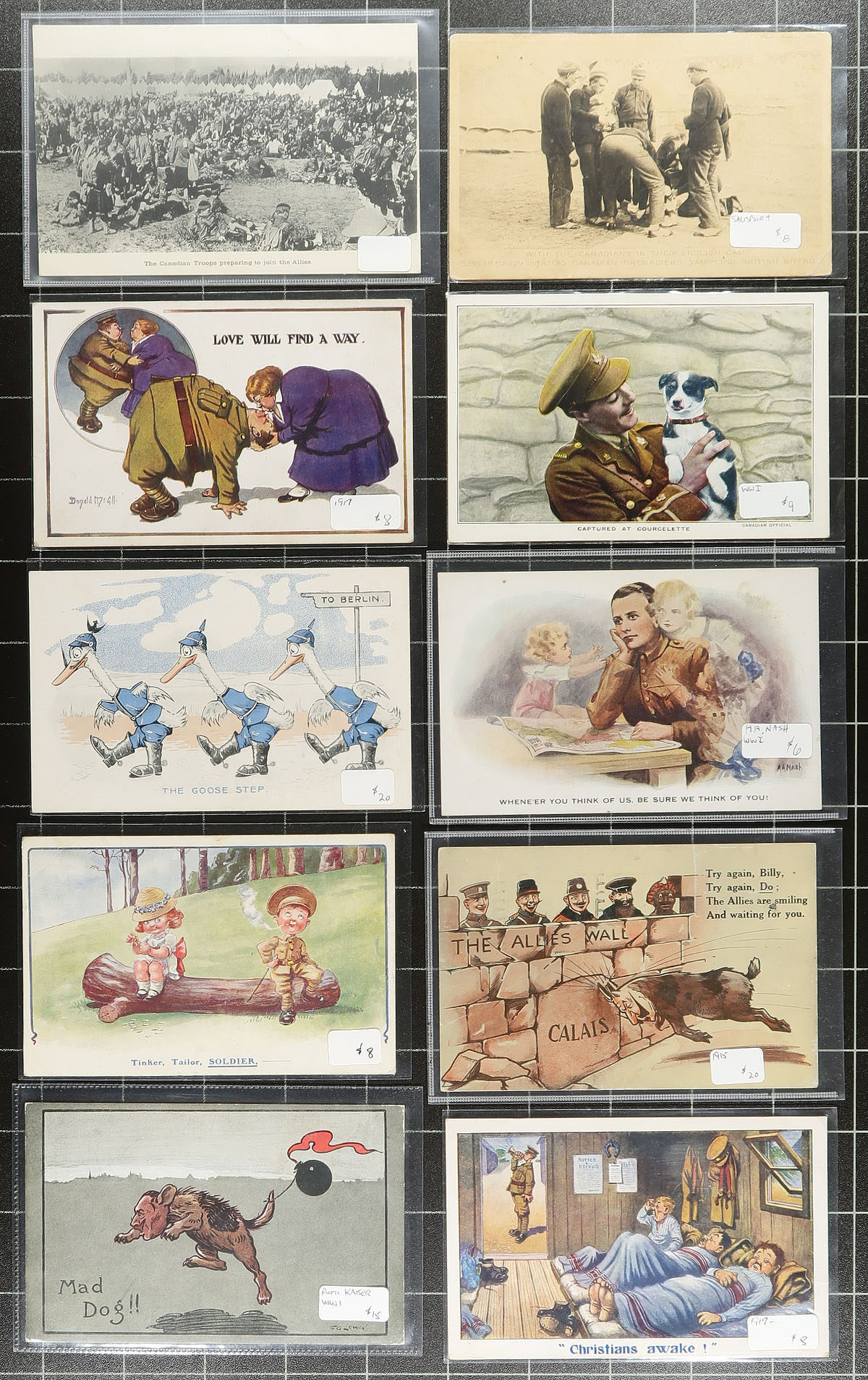 Military Themed Collection. An interesting array of 73 postcards with a "Military" theme. This theme is somewhat open-ended and includes scenes that include Patriotic, scenes from the front, soldiers in uniform, military camps, plus various "humor" illustrated etc. Primarily WWI era, with British and Canadian being the predominant types. A wonderful opportunity to acquire a large group of these at once. All cards are still in the original dealer sleeves, with the pricing generally being in the very reasonable $4-$10 range. Total retail as marked is $577.00. Estimate =