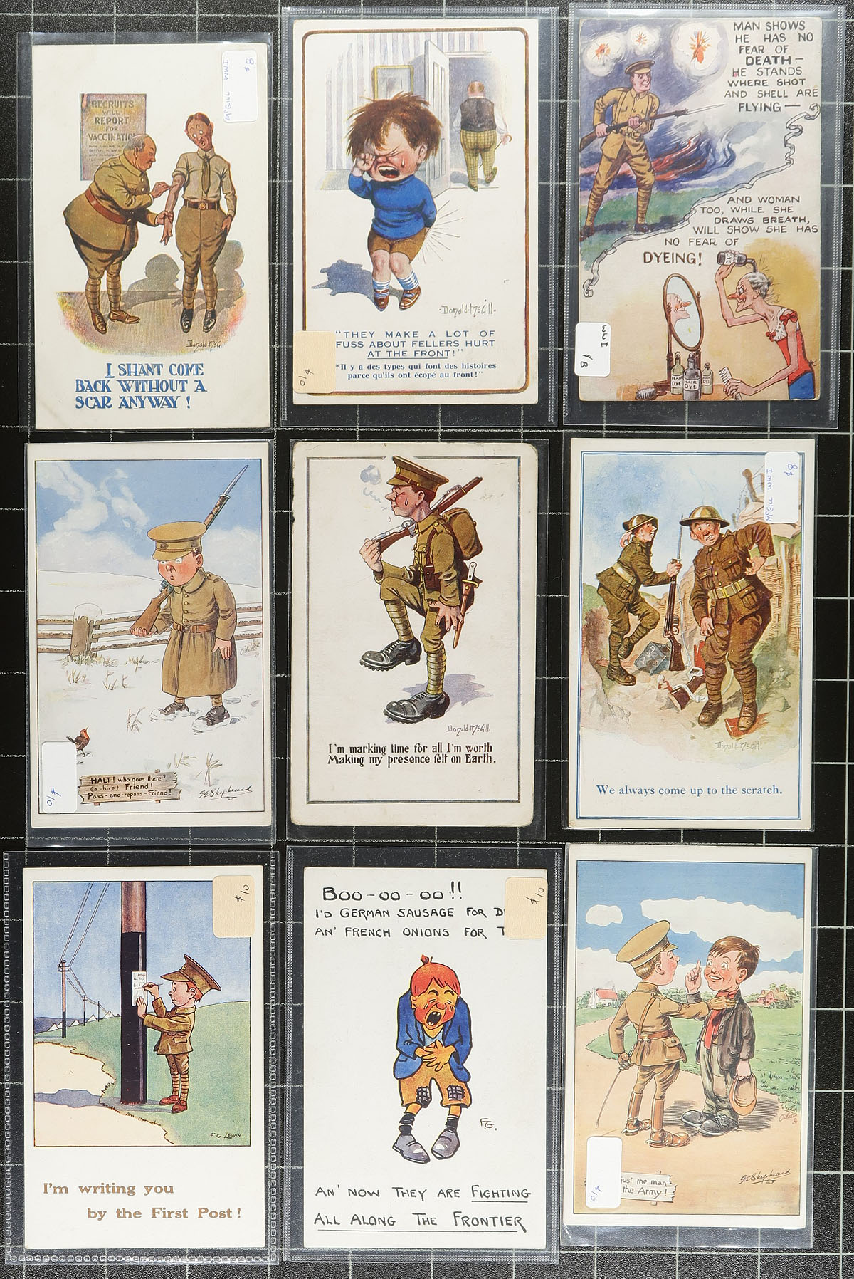 Military Themed Collection. An interesting array of 73 postcards with a "Military" theme. This theme is somewhat open-ended and includes scenes that include Patriotic, scenes from the front, soldiers in uniform, military camps, plus various "humor" illustrated etc. Primarily WWI era, with British and Canadian being the predominant types. A wonderful opportunity to acquire a large group of these at once. All cards are still in the original dealer sleeves, with the pricing generally being in the very reasonable $4-$10 range. Total retail as marked is $577.00. Estimate =