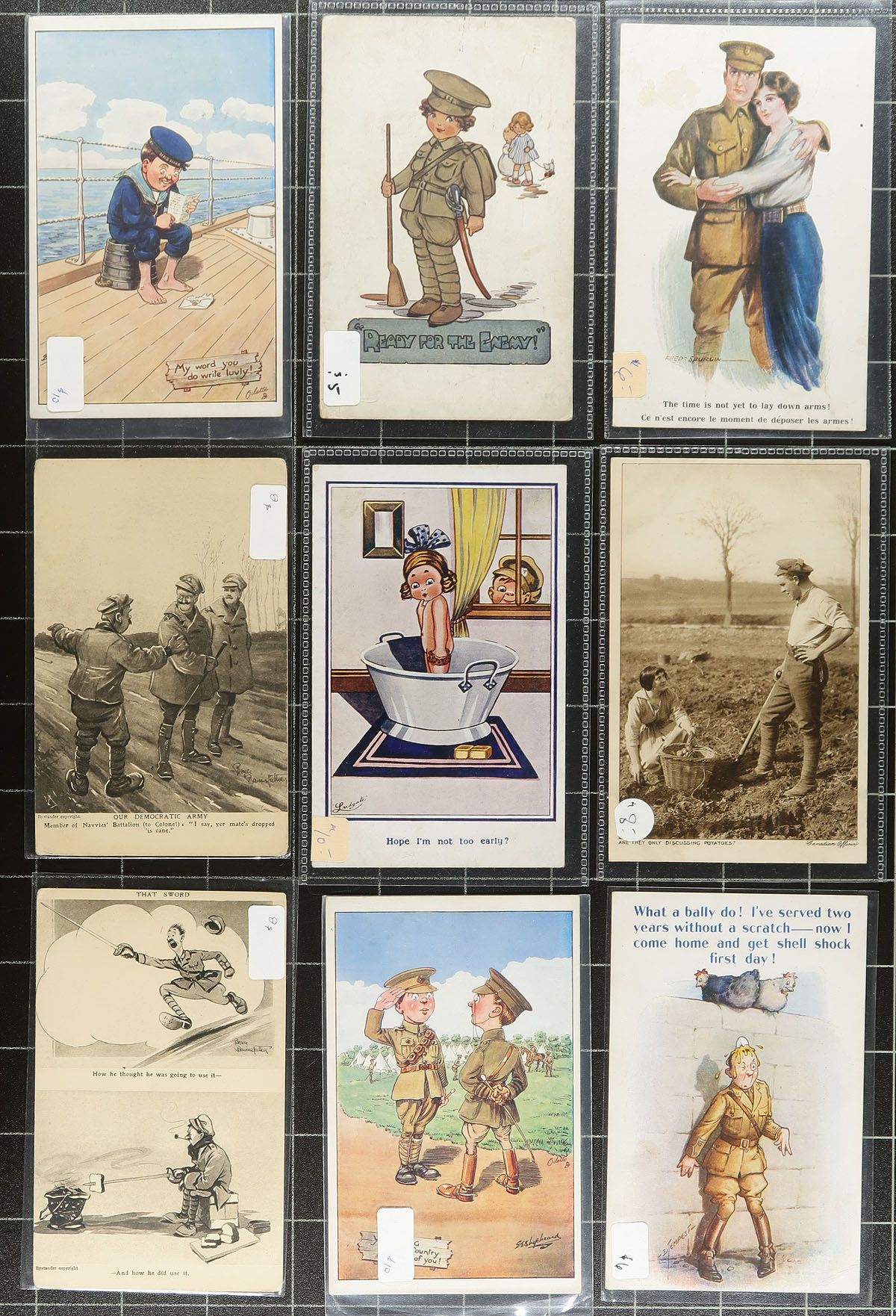Military Themed Collection. An interesting array of 73 postcards with a "Military" theme. This theme is somewhat open-ended and includes scenes that include Patriotic, scenes from the front, soldiers in uniform, military camps, plus various "humor" illustrated etc. Primarily WWI era, with British and Canadian being the predominant types. A wonderful opportunity to acquire a large group of these at once. All cards are still in the original dealer sleeves, with the pricing generally being in the very reasonable $4-$10 range. Total retail as marked is $577.00. Estimate =