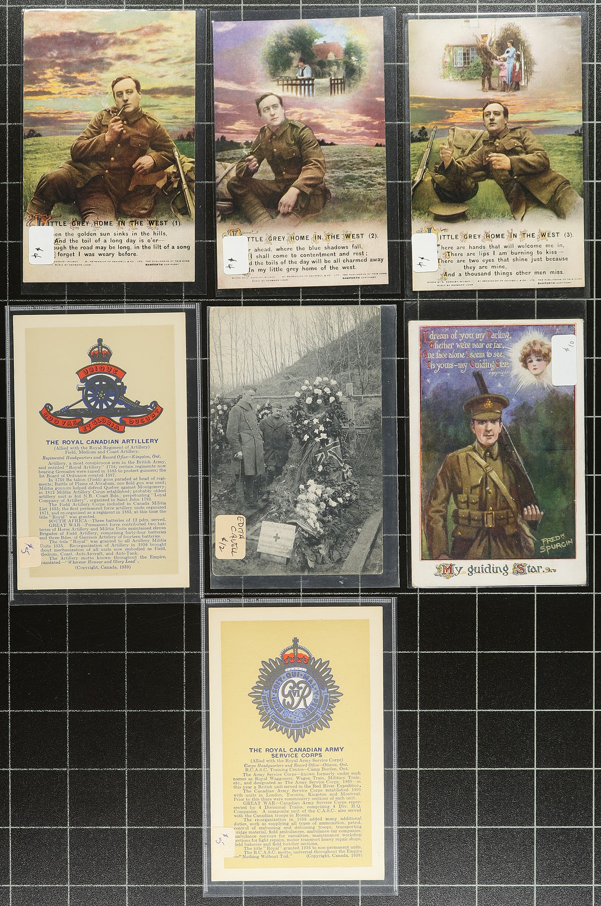 Military Themed Collection. An interesting array of 73 postcards with a "Military" theme. This theme is somewhat open-ended and includes scenes that include Patriotic, scenes from the front, soldiers in uniform, military camps, plus various "humor" illustrated etc. Primarily WWI era, with British and Canadian being the predominant types. A wonderful opportunity to acquire a large group of these at once. All cards are still in the original dealer sleeves, with the pricing generally being in the very reasonable $4-$10 range. Total retail as marked is $577.00. Estimate =