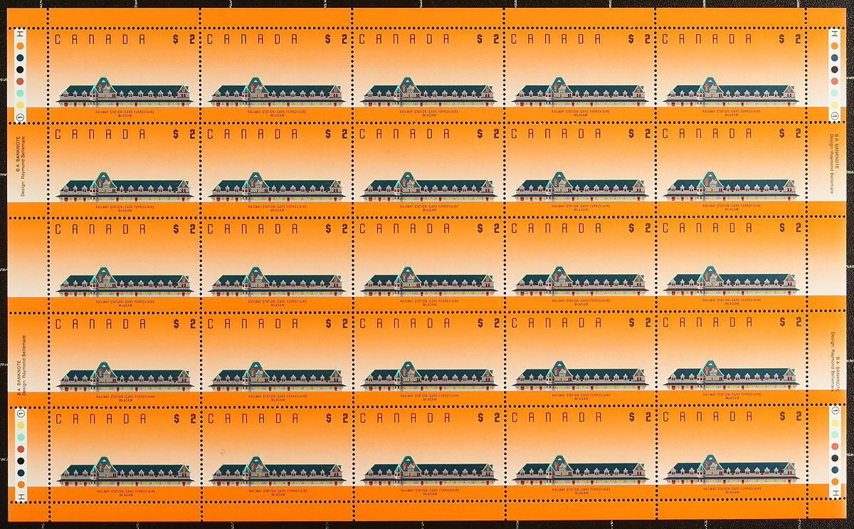 VF mint Never Hinged complete sheet the $1.00 Runnymede Library, $2.00 McAdam Railway Station and $5.00 Bonsecours Market of the 1989-1990 Architecture high-value definitives. This might be the first time we have seen all three sheets together, often neglected due to the high face value, or missing the $5.00 value (which was issued over a year after the $1/$2 values). A great find. Face value alone is $200.00. 2024 Unitrade =