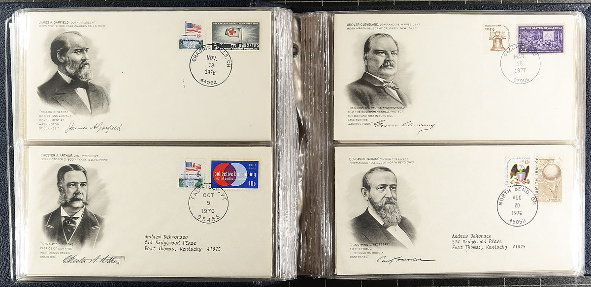 Topical collections filling a carton, containing several hundreds of stamps and covers, including America's First Ladies, Flora & Fauna of the World (3 volumes), large binder containing the Historic Stamps of America, and a few more. A nice lot for all collectors. Estimate =