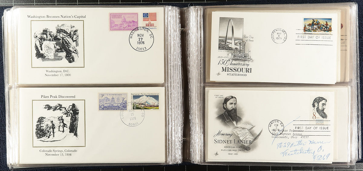 Topical collections filling a carton, containing several hundreds of stamps and covers, including America's First Ladies, Flora & Fauna of the World (3 volumes), large binder containing the Historic Stamps of America, and a few more. A nice lot for all collectors. Estimate =