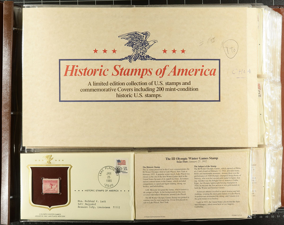 Topical collections filling a carton, containing several hundreds of stamps and covers, including America's First Ladies, Flora & Fauna of the World (3 volumes), large binder containing the Historic Stamps of America, and a few more. A nice lot for all collectors. Estimate =