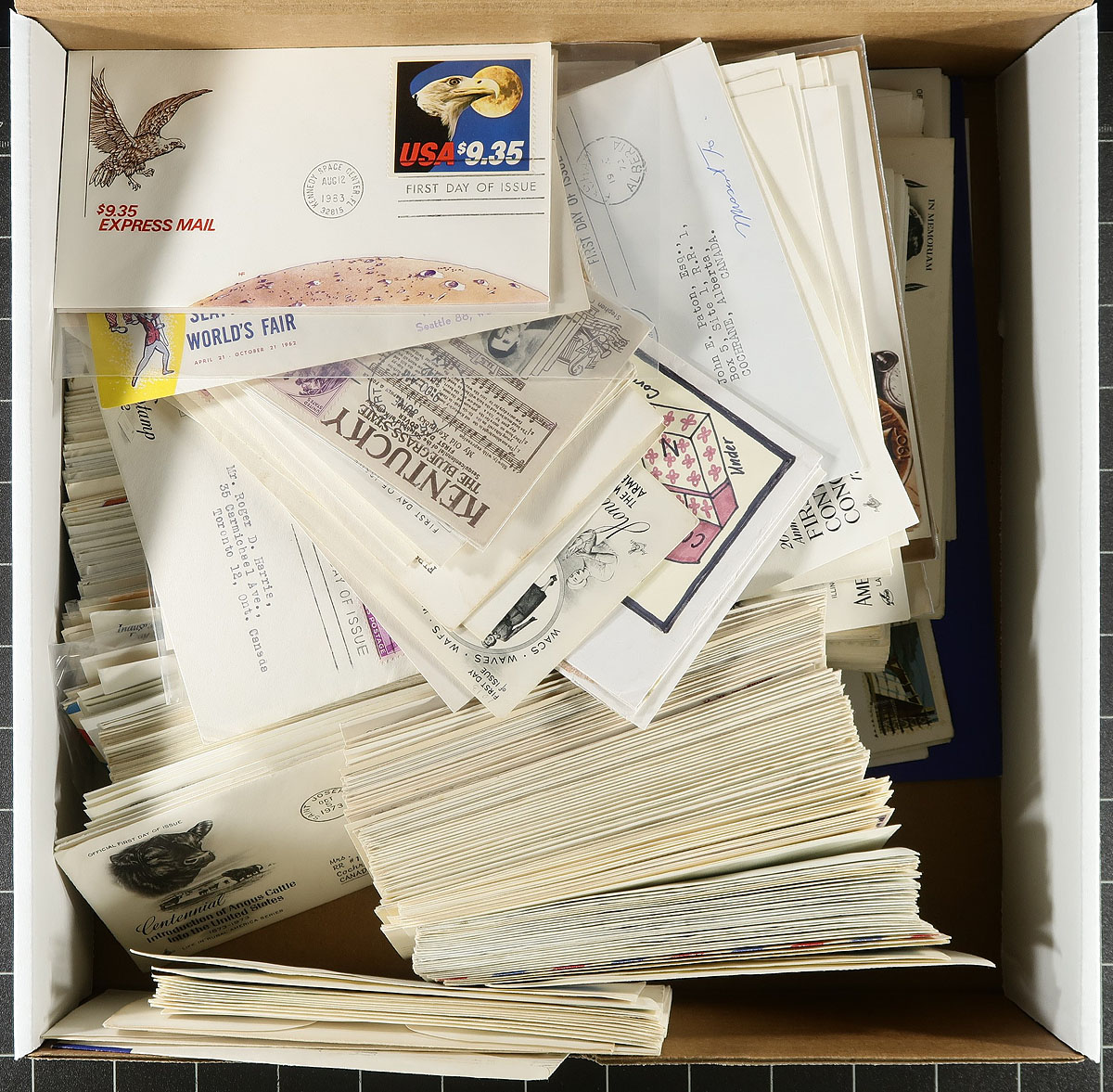 Lovely group of United States first day covers, generally ranging from the 1940's-onwards, with the overwhelming majority having private cachets, noting Art Craft, Fleetwood, several from "The Pheonix - Connecticut Group of Insurance Companies", Artmaster, and more, along with some hand drawn or painted cachets. Estimate =