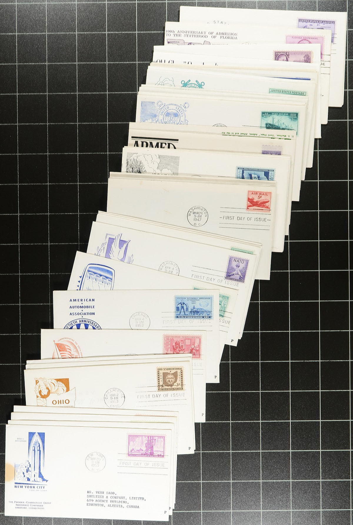 Lovely group of United States first day covers, generally ranging from the 1940's-onwards, with the overwhelming majority having private cachets, noting Art Craft, Fleetwood, several from "The Pheonix - Connecticut Group of Insurance Companies", Artmaster, and more, along with some hand drawn or painted cachets. Estimate =