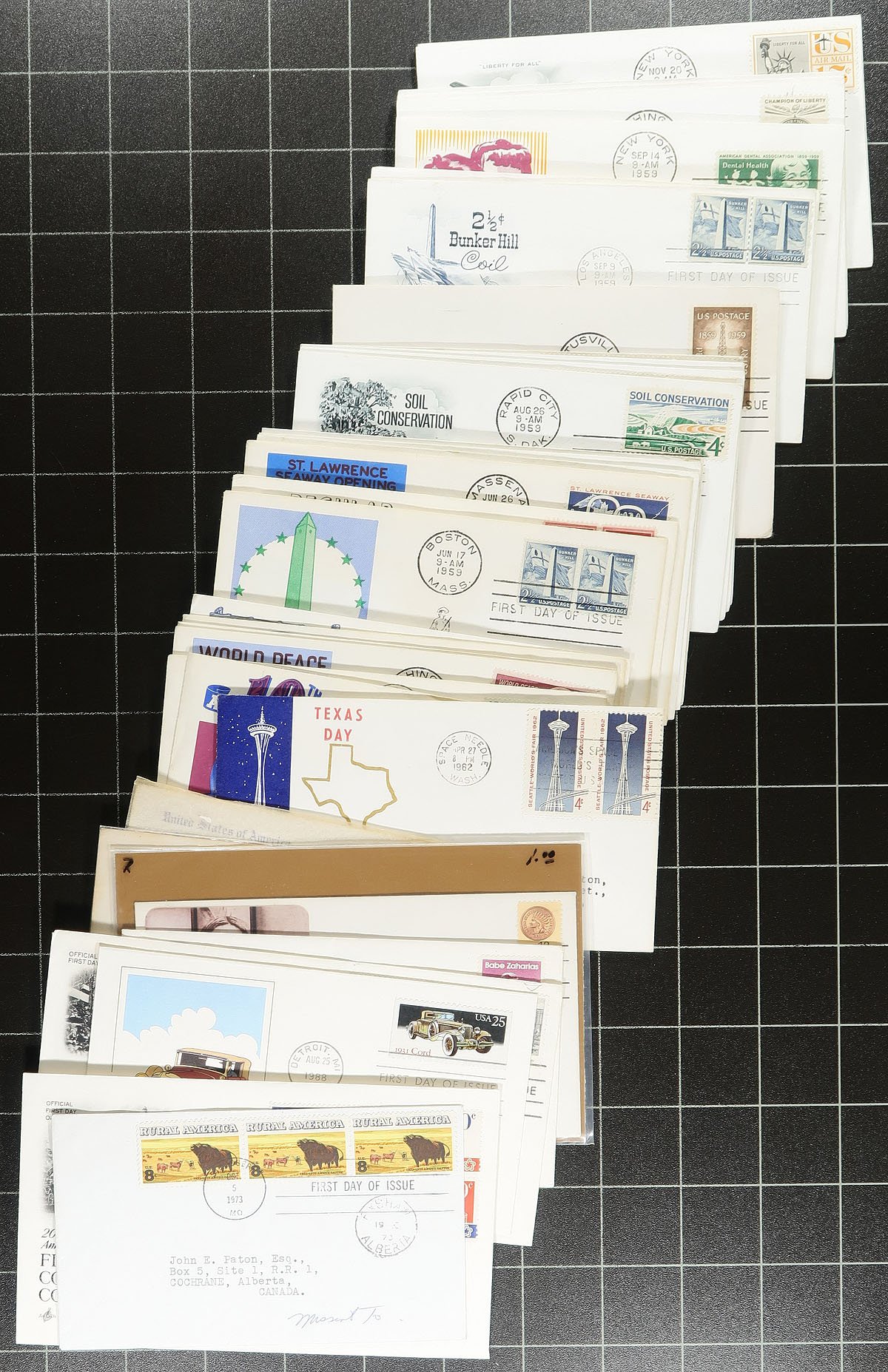 Lovely group of United States first day covers, generally ranging from the 1940's-onwards, with the overwhelming majority having private cachets, noting Art Craft, Fleetwood, several from "The Pheonix - Connecticut Group of Insurance Companies", Artmaster, and more, along with some hand drawn or painted cachets. Estimate =