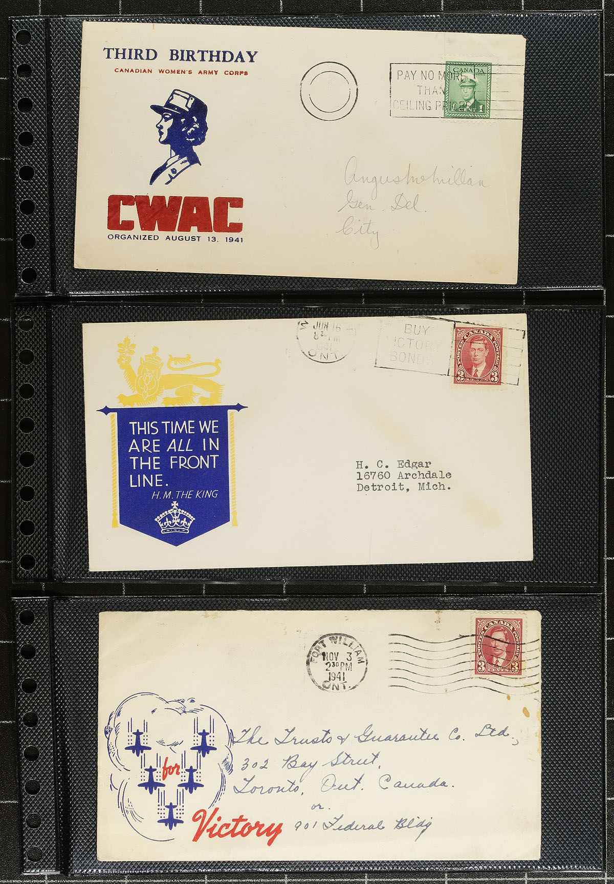 WWII Patriotic Cachet Covers. A wonderful visually striking collection of 44 illustrated envelopes, all relating the war effort, both at home and overseas. The slogans / captions on many of these were the mantra of the time, and while some have aged out, others are seemingly just as relevant today. Captions include "V for Victory", "Flying for Freedom", "Carry on Canada" etc. We don't see collections like this often! Estimate =