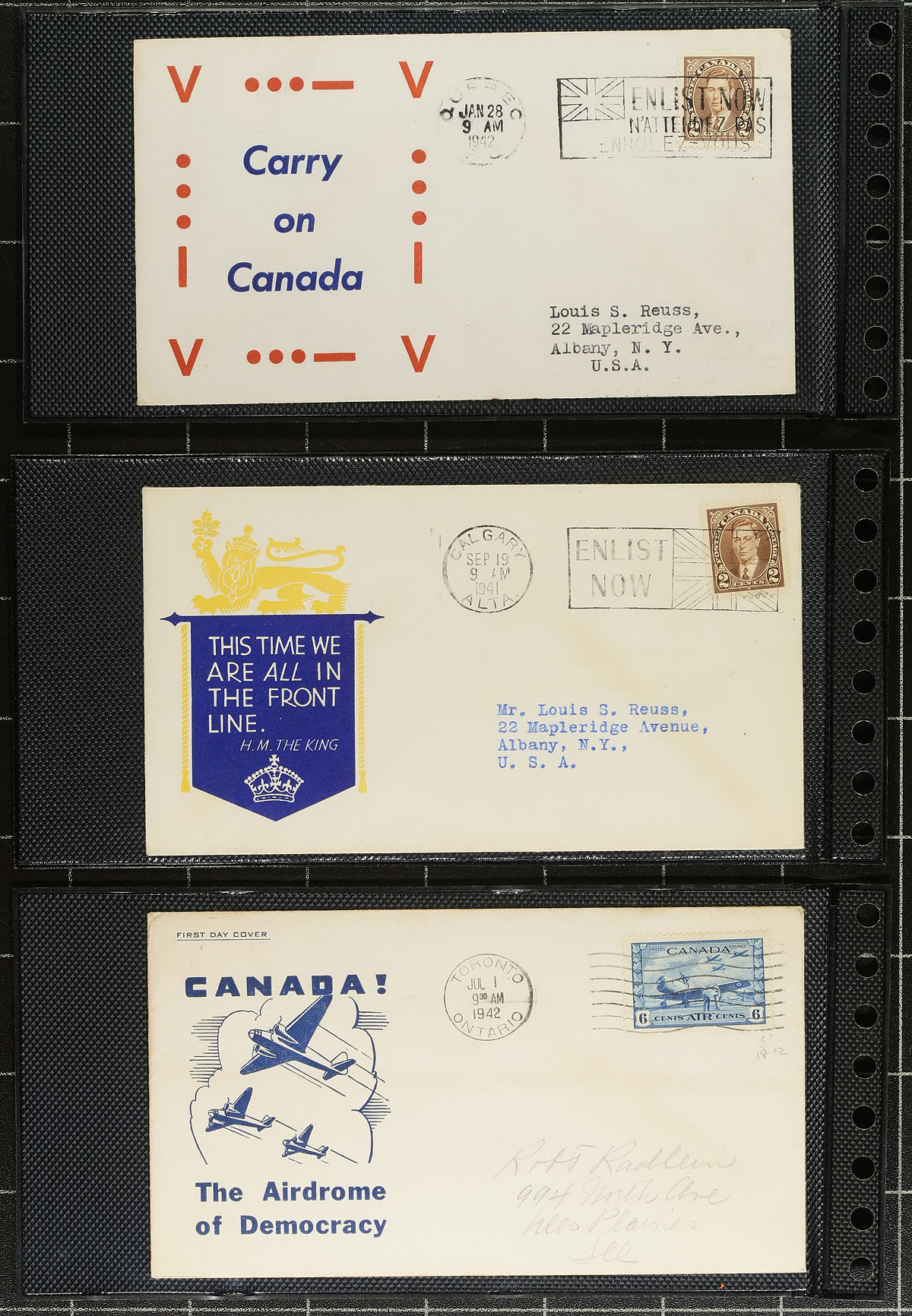 WWII Patriotic Cachet Covers. A wonderful visually striking collection of 44 illustrated envelopes, all relating the war effort, both at home and overseas. The slogans / captions on many of these were the mantra of the time, and while some have aged out, others are seemingly just as relevant today. Captions include "V for Victory", "Flying for Freedom", "Carry on Canada" etc. We don't see collections like this often! Estimate =