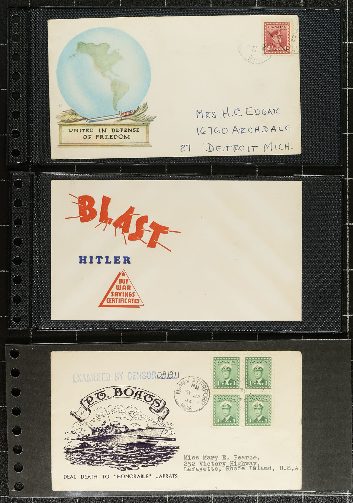WWII Patriotic Cachet Covers. A wonderful visually striking collection of 44 illustrated envelopes, all relating the war effort, both at home and overseas. The slogans / captions on many of these were the mantra of the time, and while some have aged out, others are seemingly just as relevant today. Captions include "V for Victory", "Flying for Freedom", "Carry on Canada" etc. We don't see collections like this often! Estimate =