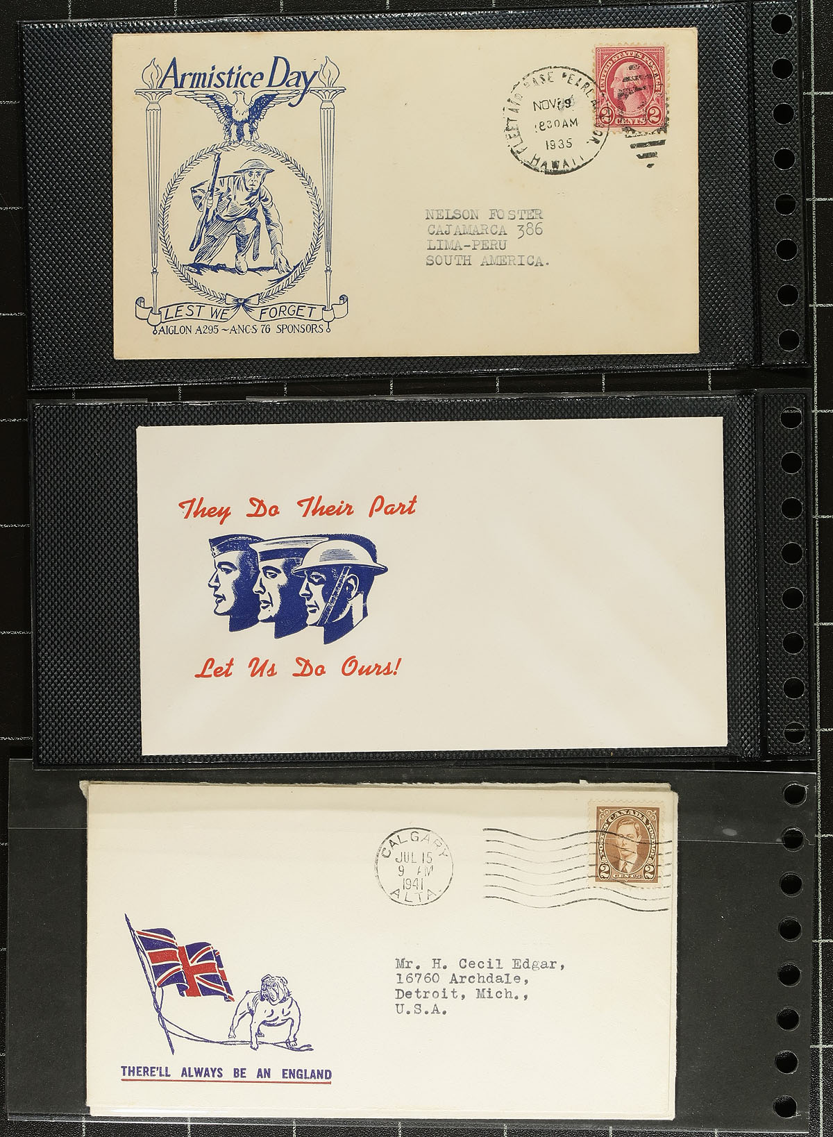 WWII Patriotic Cachet Covers. A wonderful visually striking collection of 44 illustrated envelopes, all relating the war effort, both at home and overseas. The slogans / captions on many of these were the mantra of the time, and while some have aged out, others are seemingly just as relevant today. Captions include "V for Victory", "Flying for Freedom", "Carry on Canada" etc. We don't see collections like this often! Estimate =