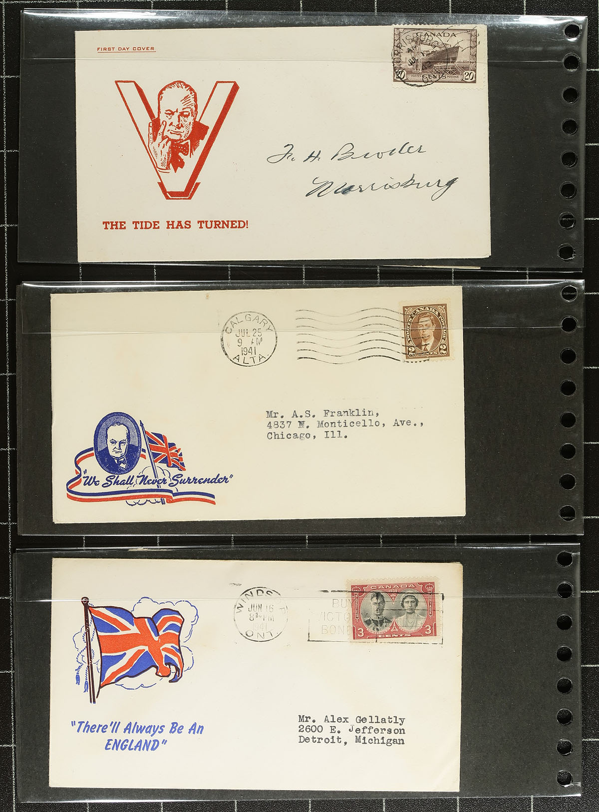 WWII Patriotic Cachet Covers. A wonderful visually striking collection of 44 illustrated envelopes, all relating the war effort, both at home and overseas. The slogans / captions on many of these were the mantra of the time, and while some have aged out, others are seemingly just as relevant today. Captions include "V for Victory", "Flying for Freedom", "Carry on Canada" etc. We don't see collections like this often! Estimate =