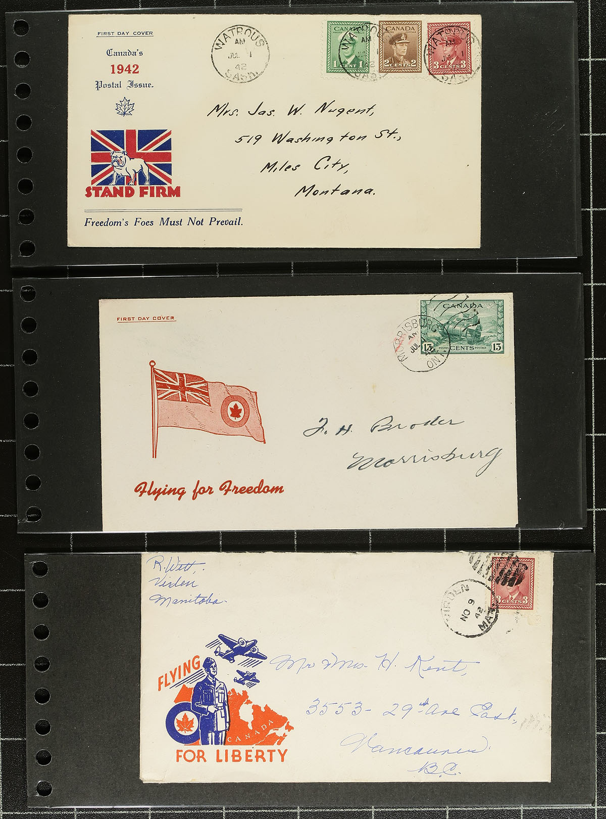 WWII Patriotic Cachet Covers. A wonderful visually striking collection of 44 illustrated envelopes, all relating the war effort, both at home and overseas. The slogans / captions on many of these were the mantra of the time, and while some have aged out, others are seemingly just as relevant today. Captions include "V for Victory", "Flying for Freedom", "Carry on Canada" etc. We don't see collections like this often! Estimate =