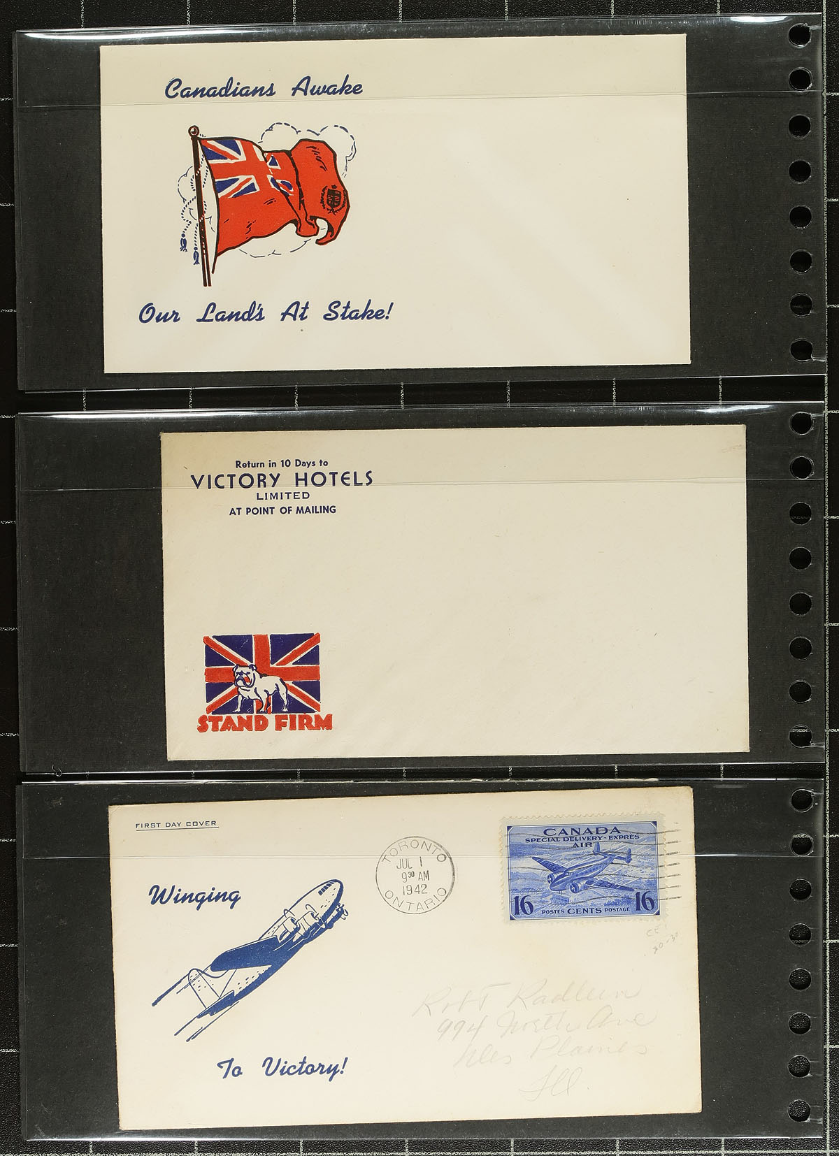 WWII Patriotic Cachet Covers. A wonderful visually striking collection of 44 illustrated envelopes, all relating the war effort, both at home and overseas. The slogans / captions on many of these were the mantra of the time, and while some have aged out, others are seemingly just as relevant today. Captions include "V for Victory", "Flying for Freedom", "Carry on Canada" etc. We don't see collections like this often! Estimate =
