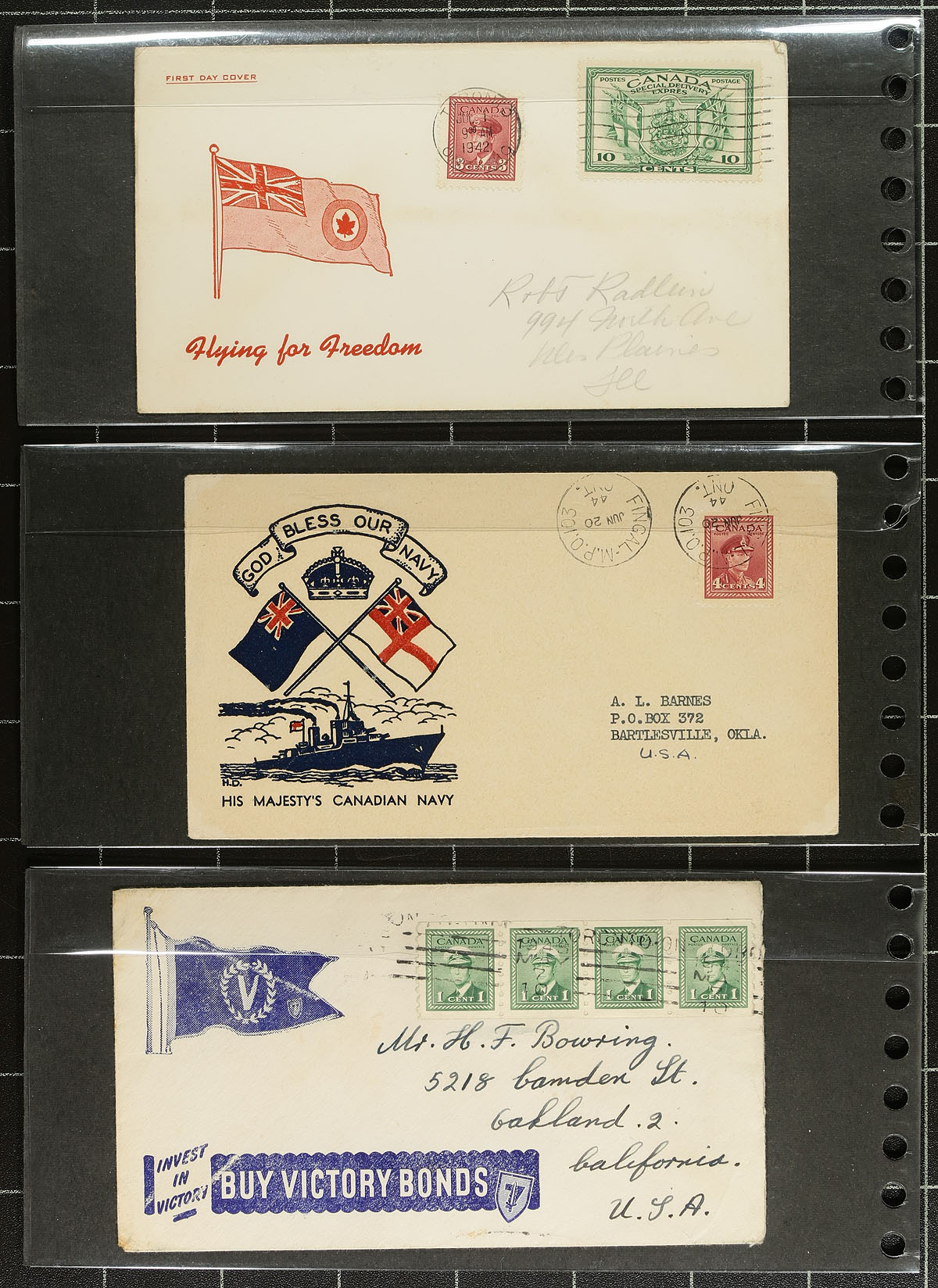 WWII Patriotic Cachet Covers. A wonderful visually striking collection of 44 illustrated envelopes, all relating the war effort, both at home and overseas. The slogans / captions on many of these were the mantra of the time, and while some have aged out, others are seemingly just as relevant today. Captions include "V for Victory", "Flying for Freedom", "Carry on Canada" etc. We don't see collections like this often! Estimate =