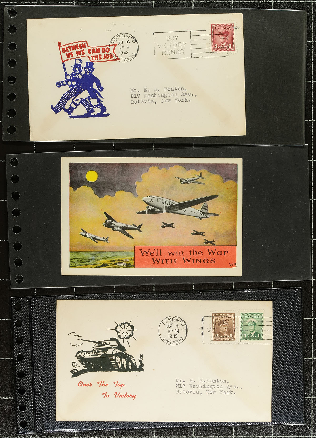WWII Patriotic Cachet Covers. A wonderful visually striking collection of 44 illustrated envelopes, all relating the war effort, both at home and overseas. The slogans / captions on many of these were the mantra of the time, and while some have aged out, others are seemingly just as relevant today. Captions include "V for Victory", "Flying for Freedom", "Carry on Canada" etc. We don't see collections like this often! Estimate =
