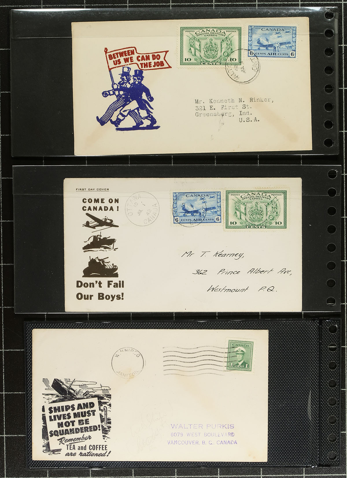 WWII Patriotic Cachet Covers. A wonderful visually striking collection of 44 illustrated envelopes, all relating the war effort, both at home and overseas. The slogans / captions on many of these were the mantra of the time, and while some have aged out, others are seemingly just as relevant today. Captions include "V for Victory", "Flying for Freedom", "Carry on Canada" etc. We don't see collections like this often! Estimate =