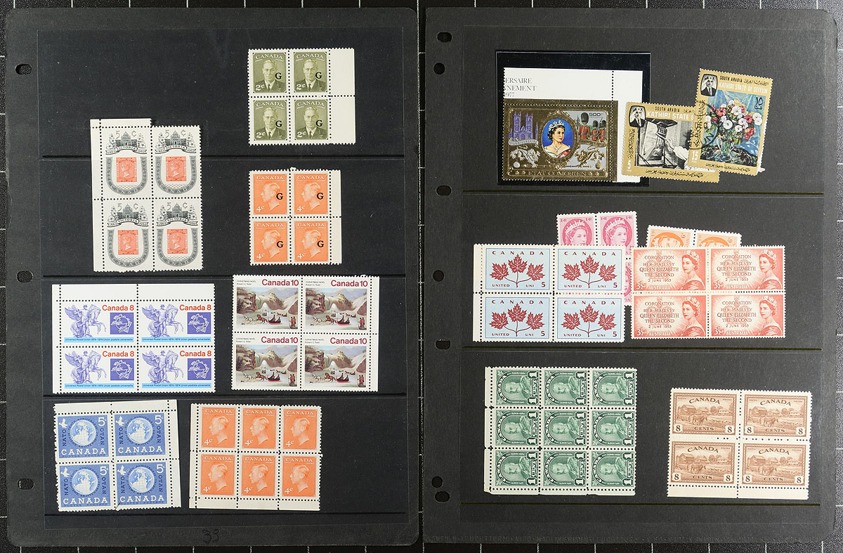 Collection of mostly mint, including blocks / multiples from the QV to QEII era, all arranged on about two dozen stockpages, withing a binder. Noted Admirals, Map Stamps, Jubilee Block, many 1935 10c RCMP, coils, $1.00 Vancouver Harbour singles and plate blocks, 1972 Earth Sciences, 1975/1976 Olympics high-values, Radio Canada, Suzor-Cote etc. Lots of value here, expect the early material to be a mix of Hinged/Never Hinged, with much of the later being Never Hinged. A great lot to keep what you need and sell the rest. Catalogue value would add up quickly here! Offered as received from a local estate. Estimate =