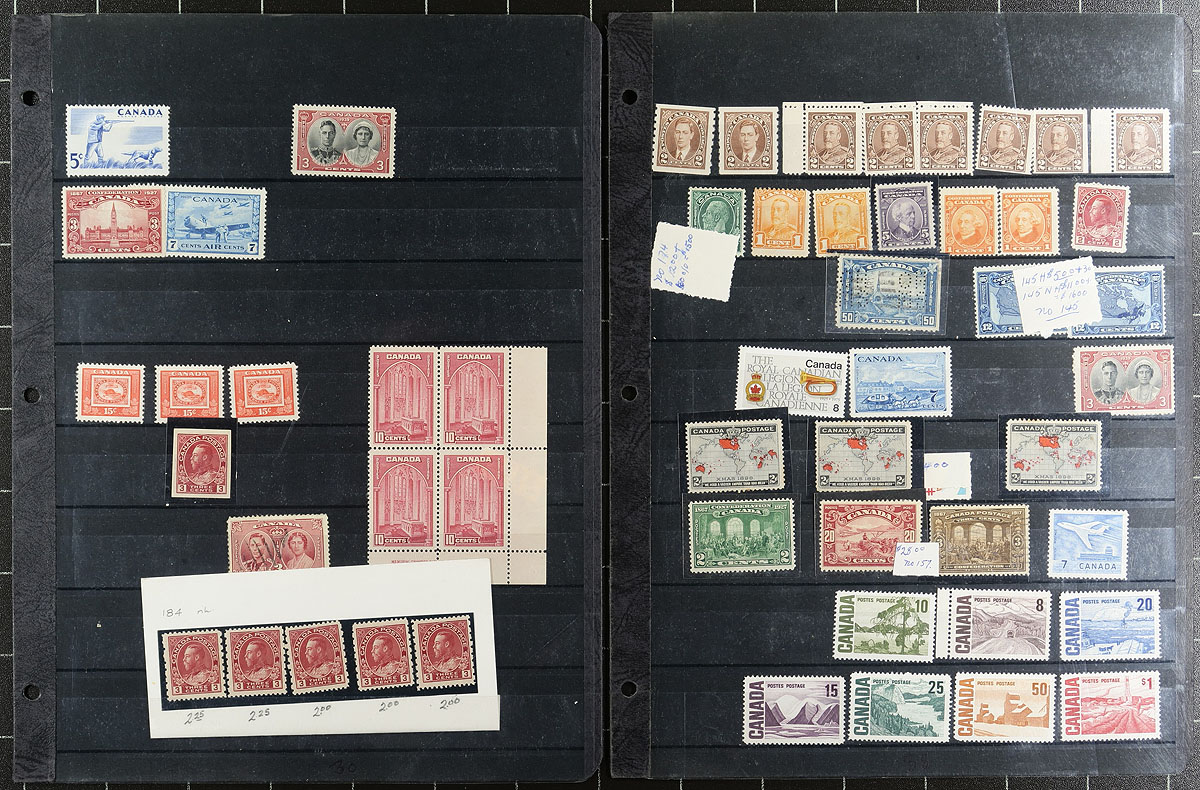 Collection of mostly mint, including blocks / multiples from the QV to QEII era, all arranged on about two dozen stockpages, withing a binder. Noted Admirals, Map Stamps, Jubilee Block, many 1935 10c RCMP, coils, $1.00 Vancouver Harbour singles and plate blocks, 1972 Earth Sciences, 1975/1976 Olympics high-values, Radio Canada, Suzor-Cote etc. Lots of value here, expect the early material to be a mix of Hinged/Never Hinged, with much of the later being Never Hinged. A great lot to keep what you need and sell the rest. Catalogue value would add up quickly here! Offered as received from a local estate. Estimate =