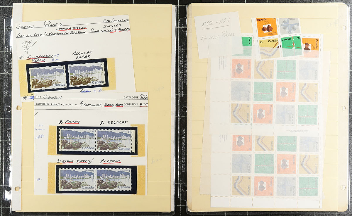 Collection of mostly mint, including blocks / multiples from the QV to QEII era, all arranged on about two dozen stockpages, withing a binder. Noted Admirals, Map Stamps, Jubilee Block, many 1935 10c RCMP, coils, $1.00 Vancouver Harbour singles and plate blocks, 1972 Earth Sciences, 1975/1976 Olympics high-values, Radio Canada, Suzor-Cote etc. Lots of value here, expect the early material to be a mix of Hinged/Never Hinged, with much of the later being Never Hinged. A great lot to keep what you need and sell the rest. Catalogue value would add up quickly here! Offered as received from a local estate. Estimate =