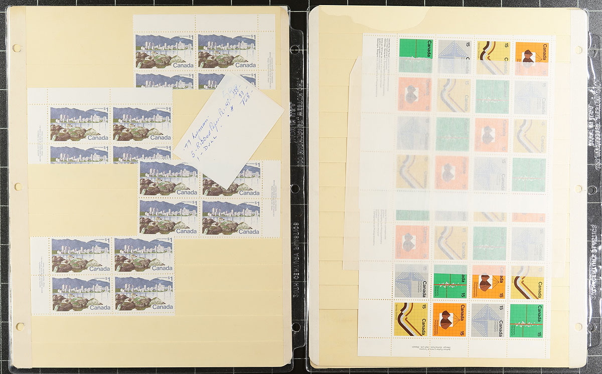 Collection of mostly mint, including blocks / multiples from the QV to QEII era, all arranged on about two dozen stockpages, withing a binder. Noted Admirals, Map Stamps, Jubilee Block, many 1935 10c RCMP, coils, $1.00 Vancouver Harbour singles and plate blocks, 1972 Earth Sciences, 1975/1976 Olympics high-values, Radio Canada, Suzor-Cote etc. Lots of value here, expect the early material to be a mix of Hinged/Never Hinged, with much of the later being Never Hinged. A great lot to keep what you need and sell the rest. Catalogue value would add up quickly here! Offered as received from a local estate. Estimate =