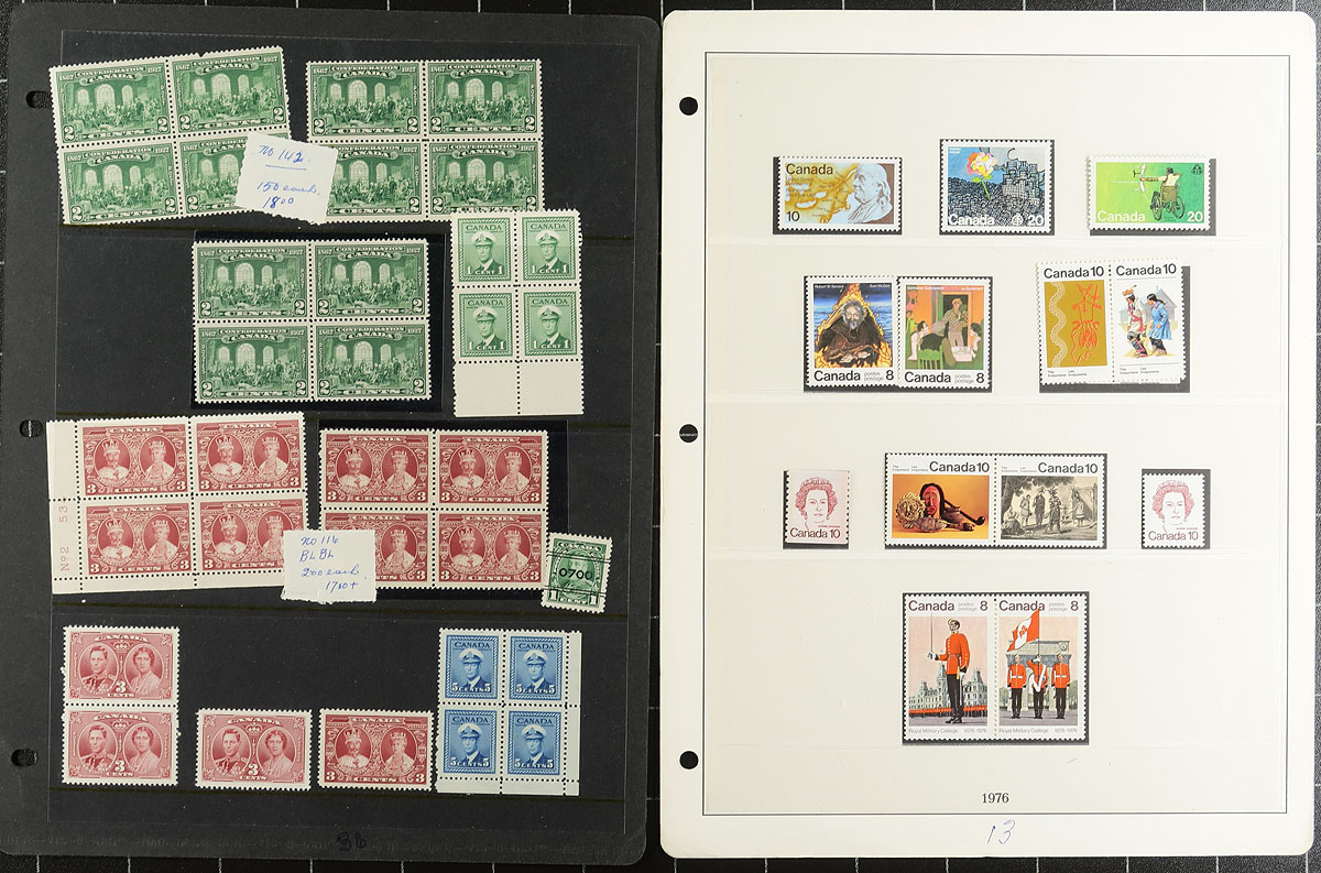 Collection of mostly mint, including blocks / multiples from the QV to QEII era, all arranged on about two dozen stockpages, withing a binder. Noted Admirals, Map Stamps, Jubilee Block, many 1935 10c RCMP, coils, $1.00 Vancouver Harbour singles and plate blocks, 1972 Earth Sciences, 1975/1976 Olympics high-values, Radio Canada, Suzor-Cote etc. Lots of value here, expect the early material to be a mix of Hinged/Never Hinged, with much of the later being Never Hinged. A great lot to keep what you need and sell the rest. Catalogue value would add up quickly here! Offered as received from a local estate. Estimate =