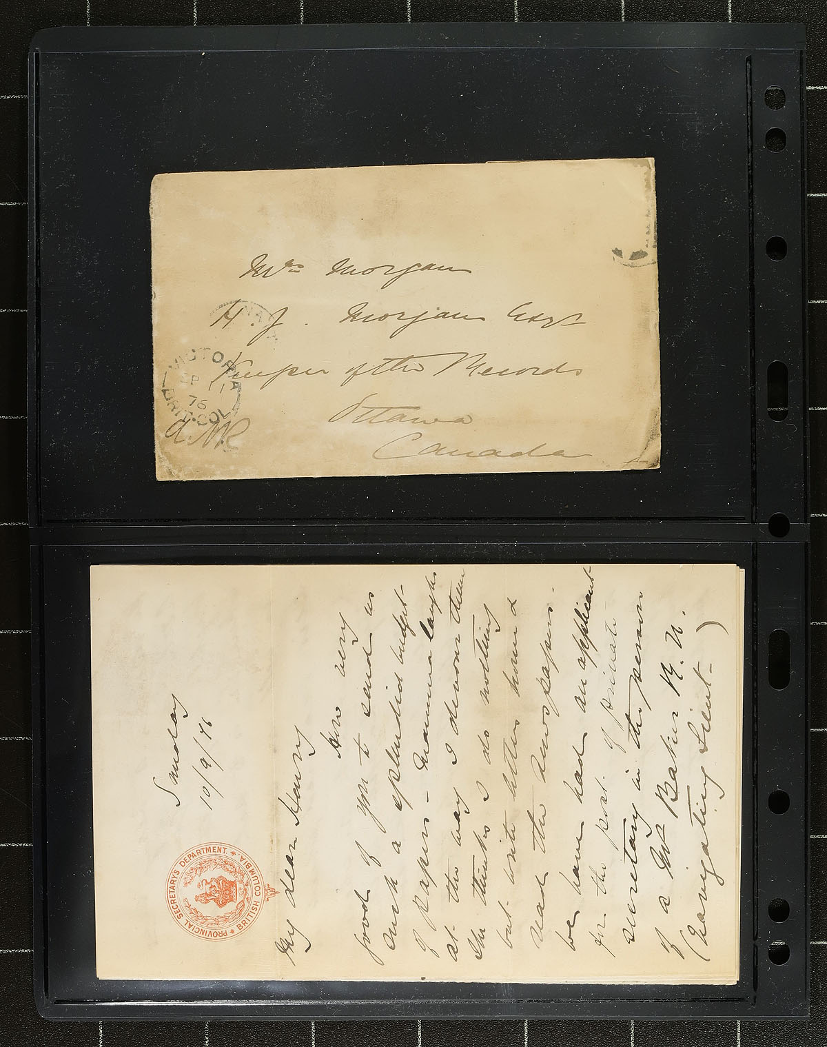BC British Columbia Postal History. A historically interesting and important group of 7 covers, all dated 1876/1877 (6 of which have letters/contents) posted from Victoria BC to Henry Morgan "State Department" Ottawa. All look to be sent from Government House, by Morgan's wife, with some of the letters being on official "Government House, British Columbia" stationery. The letters are a bit tough to read, and some might need some re-ordering or are incomplete. Of particular note, is an interesting 1877 dated printed invitation for a dinner/dance. All covers sent as political / government Free Franks, with both "Victoria BC" and "Victoria Brit.Col" postmarks. Estimate =