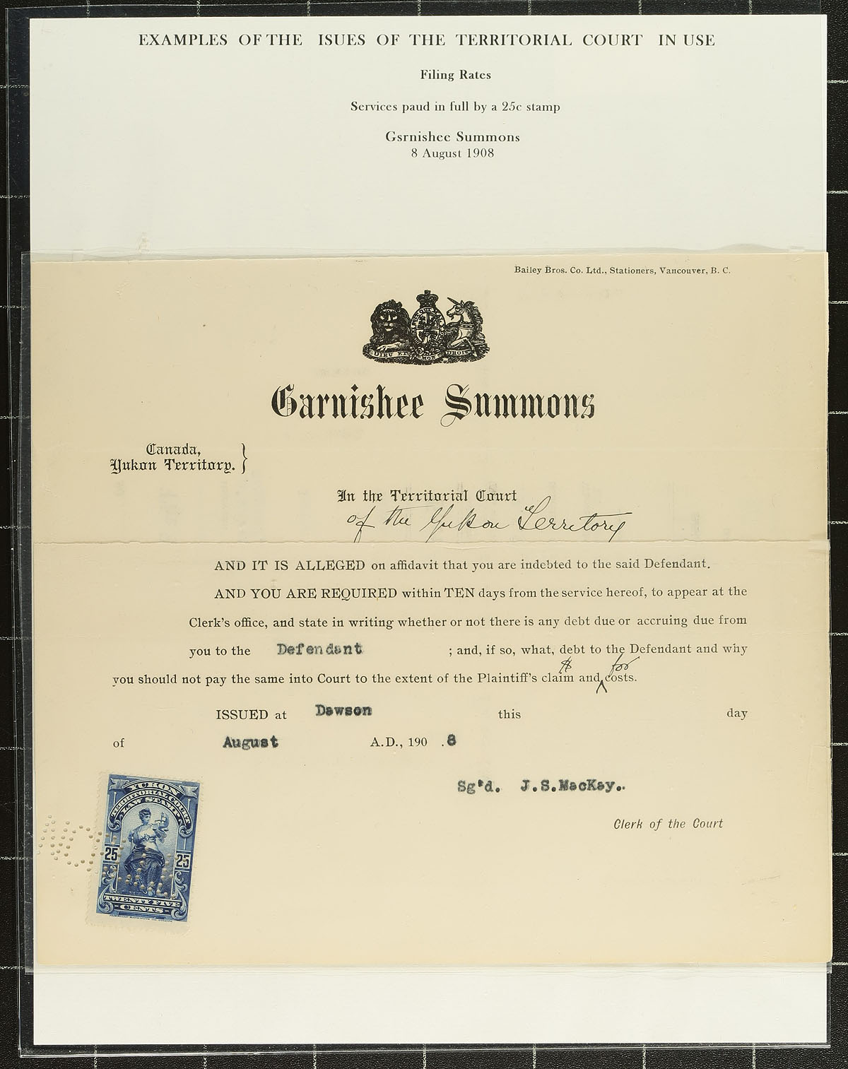 Yukon Law Stamps. A fascinating array of 8 different documents 1908-1963, 7 are franked with single usage revenue stamps including costs of 25c (basic cost of filing a document), but also 50c, $1.00, $2.00, $3.00 and 25c on 50c surcharge / $2.00 on 50c surcharge (the latter noted in van Dam as "very rare on document"). The final 8th document is franked with all three different Territorial Court issues, with the 25c on 50c, $1.00 and $5.00 on 50c surcharge (a very uncommon use of YL18 on document). All still on the original owner's exhibit pages. Estimate =