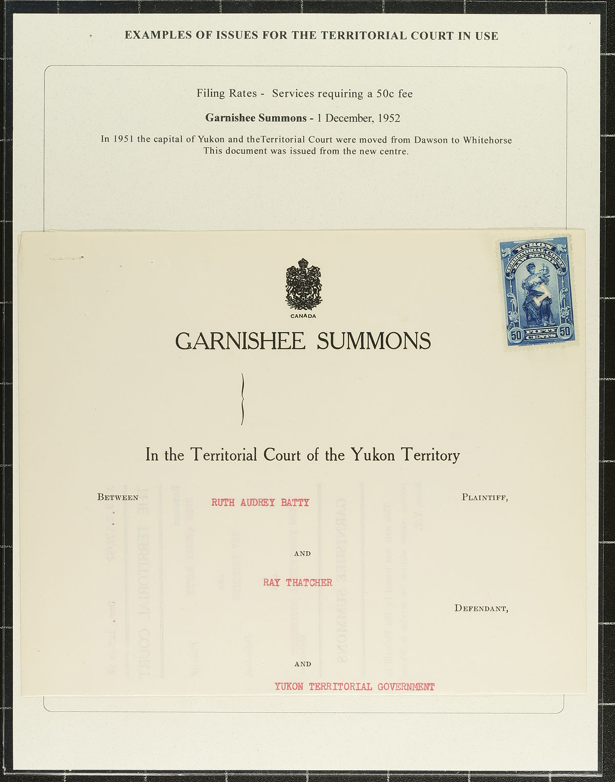 Yukon Law Stamps. A fascinating array of 8 different documents 1908-1963, 7 are franked with single usage revenue stamps including costs of 25c (basic cost of filing a document), but also 50c, $1.00, $2.00, $3.00 and 25c on 50c surcharge / $2.00 on 50c surcharge (the latter noted in van Dam as "very rare on document"). The final 8th document is franked with all three different Territorial Court issues, with the 25c on 50c, $1.00 and $5.00 on 50c surcharge (a very uncommon use of YL18 on document). All still on the original owner's exhibit pages. Estimate =