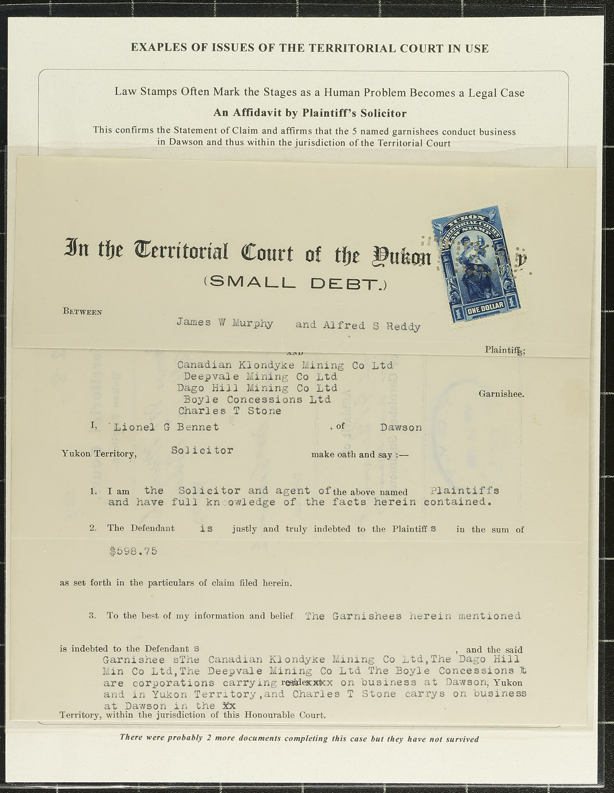 Yukon Law Stamps. A fascinating array of 8 different documents 1908-1963, 7 are franked with single usage revenue stamps including costs of 25c (basic cost of filing a document), but also 50c, $1.00, $2.00, $3.00 and 25c on 50c surcharge / $2.00 on 50c surcharge (the latter noted in van Dam as "very rare on document"). The final 8th document is franked with all three different Territorial Court issues, with the 25c on 50c, $1.00 and $5.00 on 50c surcharge (a very uncommon use of YL18 on document). All still on the original owner's exhibit pages. Estimate =