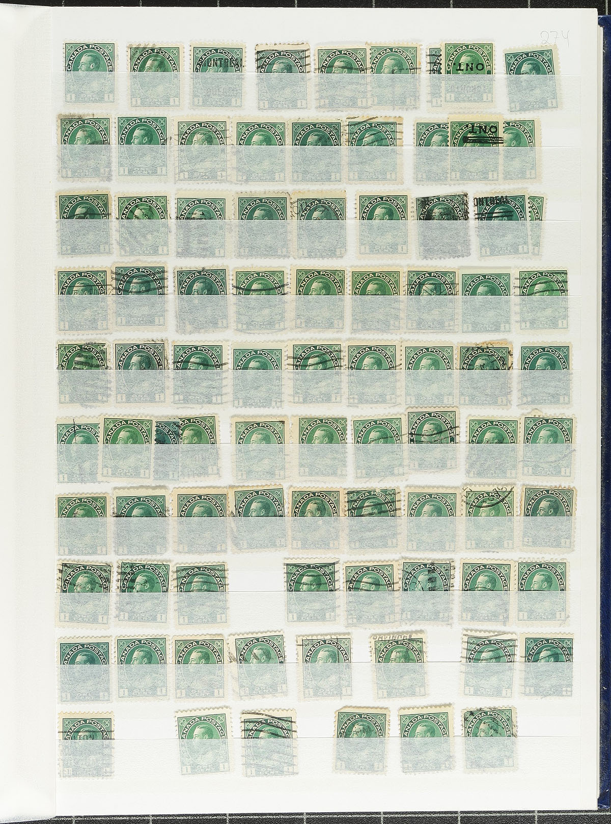 Used Admiral Holding. A collector's holding of over 1500 used Admiral stamps, from 1c to $1.00 plus a few coils. Seemingly added as acquired by the collector, so likely unchecked for any varieties, and we noted the odd better postmark / perfin / precancel etc. All house in a like-new 64-page Unisafe stockbook, worth a pretty penny alone. Estimate =